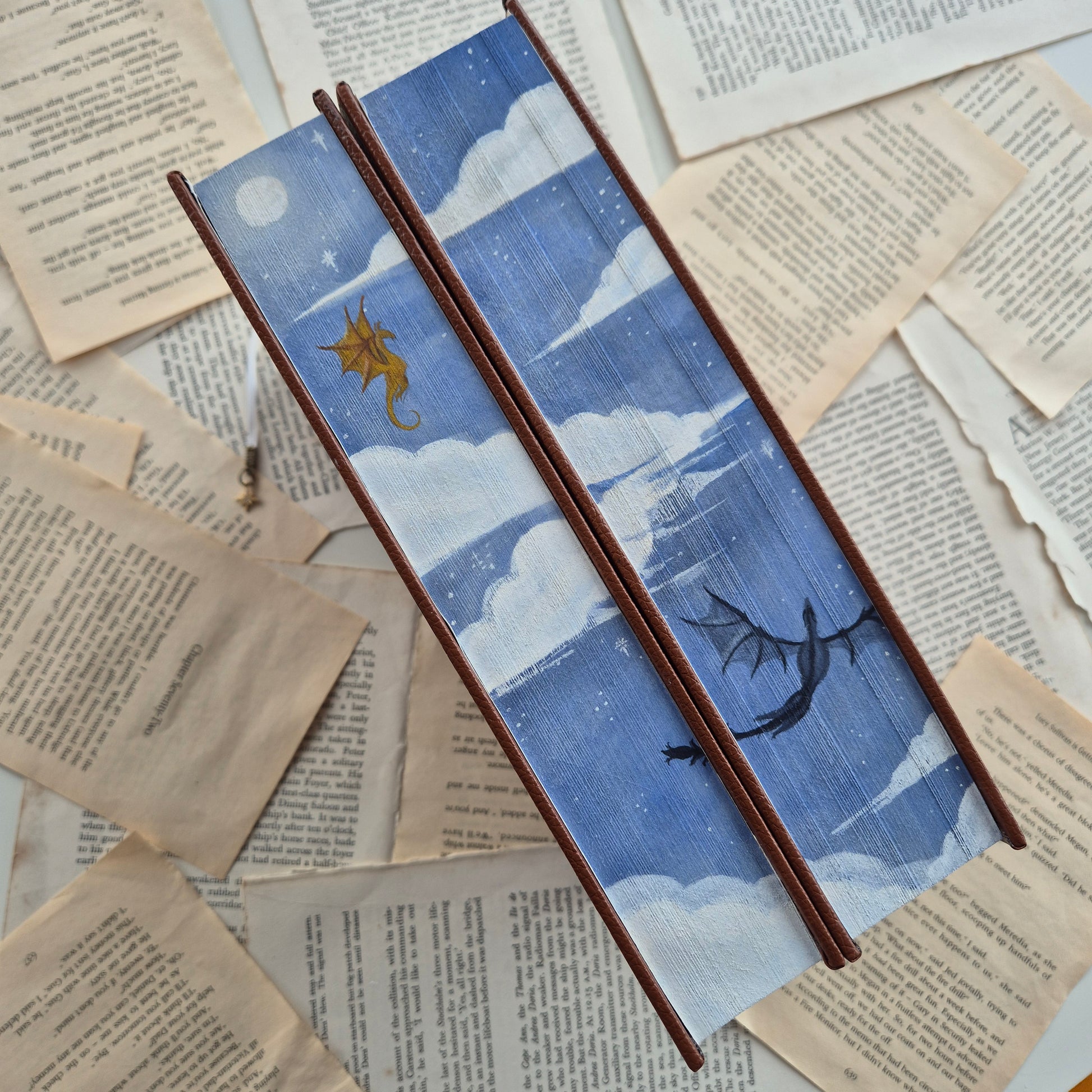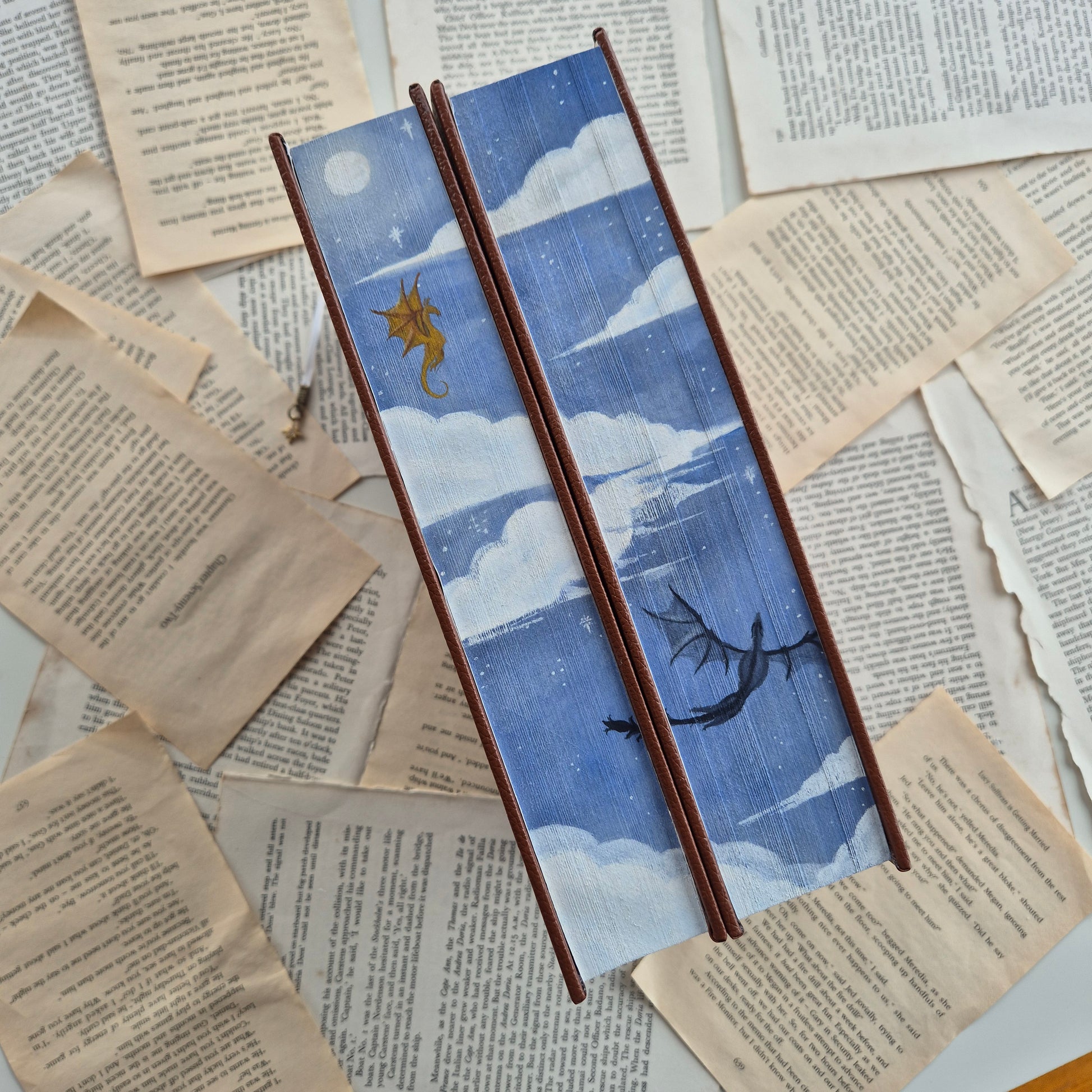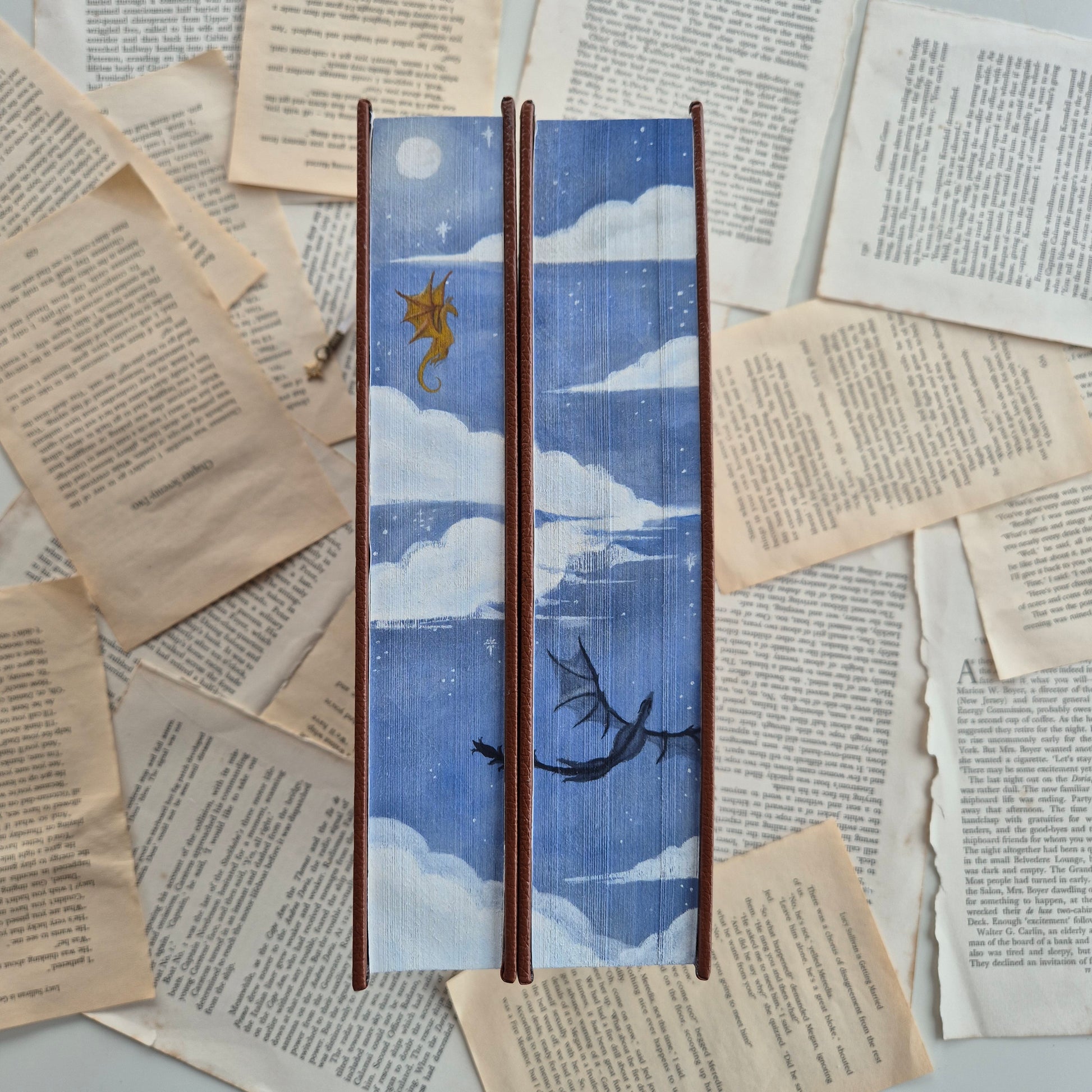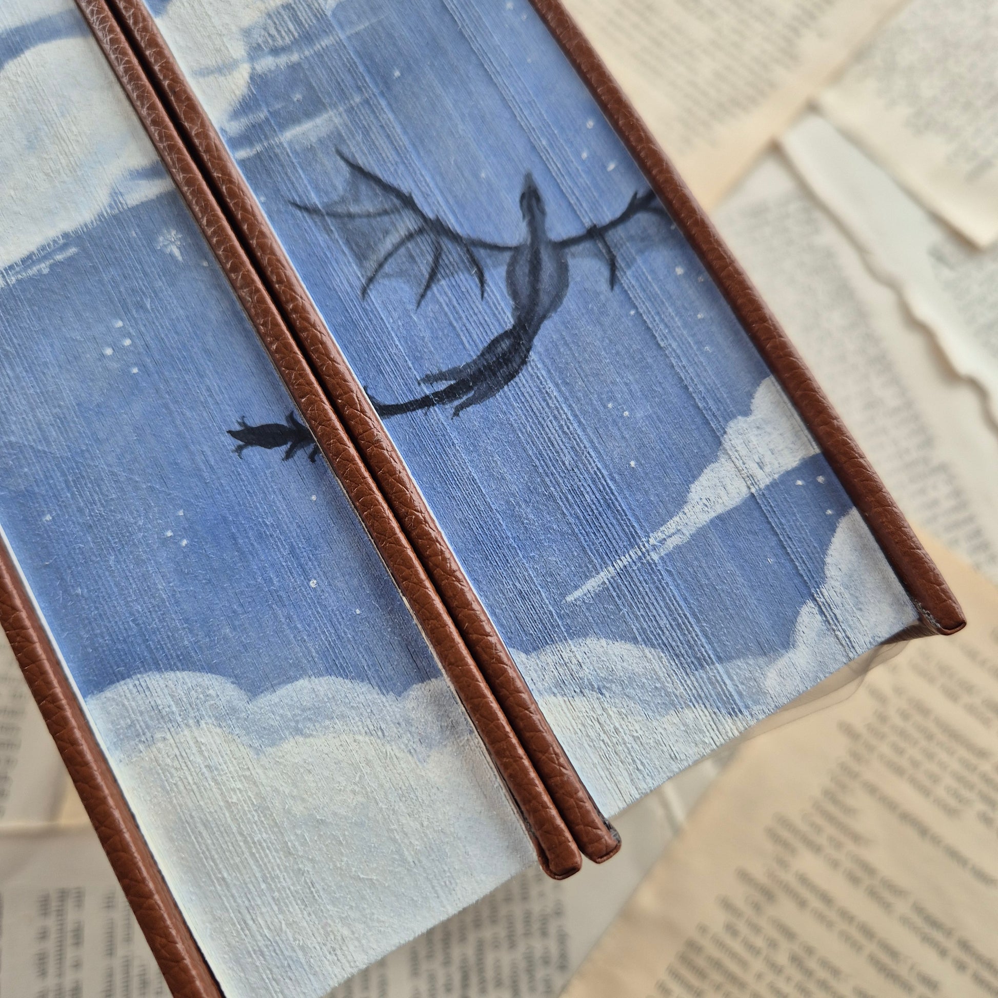 Ces reliures ont été faites à la main et présentent des bords aquarellés peints à la main, la scène représente deux dragons qui figurent dans la série dans un décor de ciel nocturne, les reliures sont reliées en similicuir marron et présentent des détails en feuille d'or. Chaque livre est livré avec un ruban de livre en soie avec une breloque étoile en or et en zircone cubique pour correspondre au thème de la nuit.