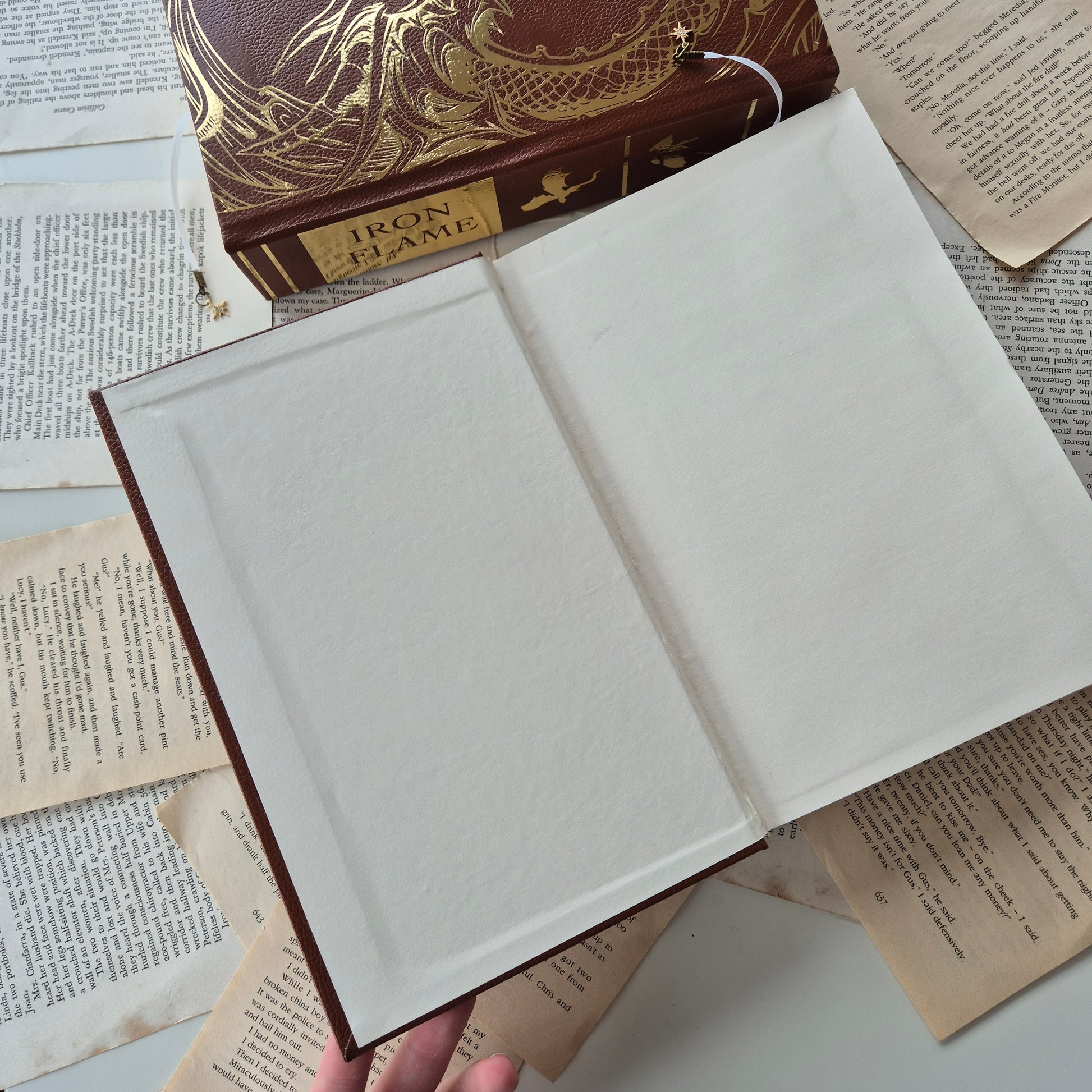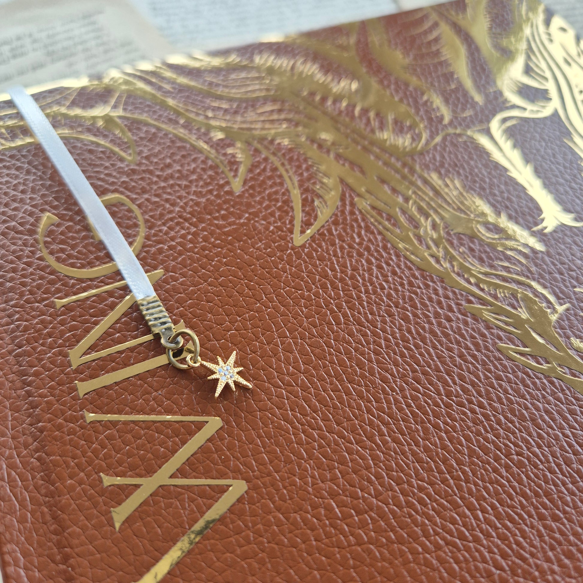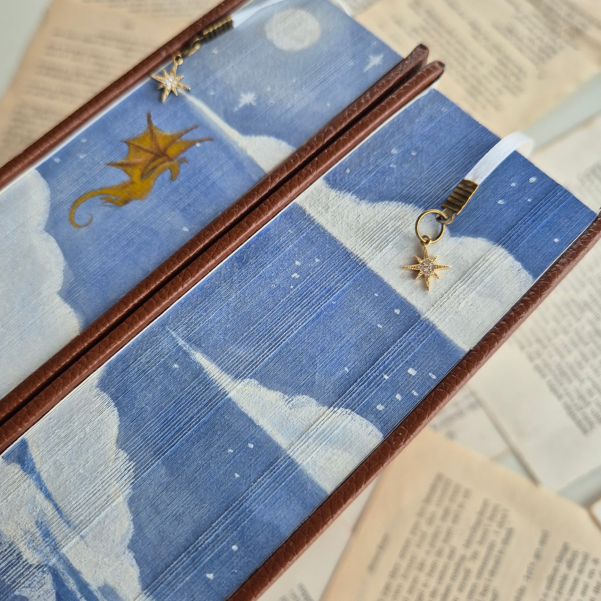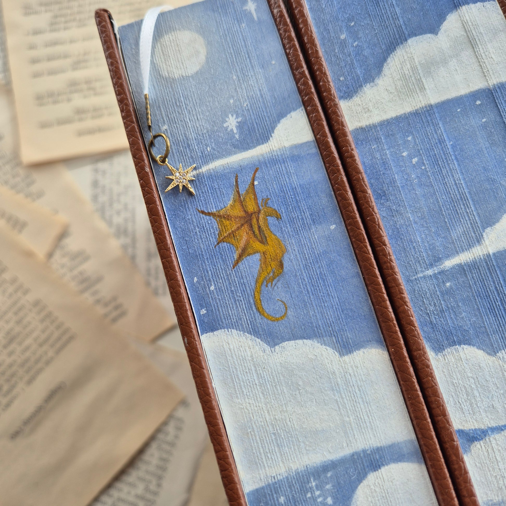 Ces reliures ont été faites à la main et présentent des bords aquarellés peints à la main, la scène représente deux dragons qui figurent dans la série dans un décor de ciel nocturne, les reliures sont reliées en similicuir marron et présentent des détails en feuille d'or. Chaque livre est livré avec un ruban de livre en soie avec une breloque étoile en or et en zircone cubique pour correspondre au thème de la nuit.