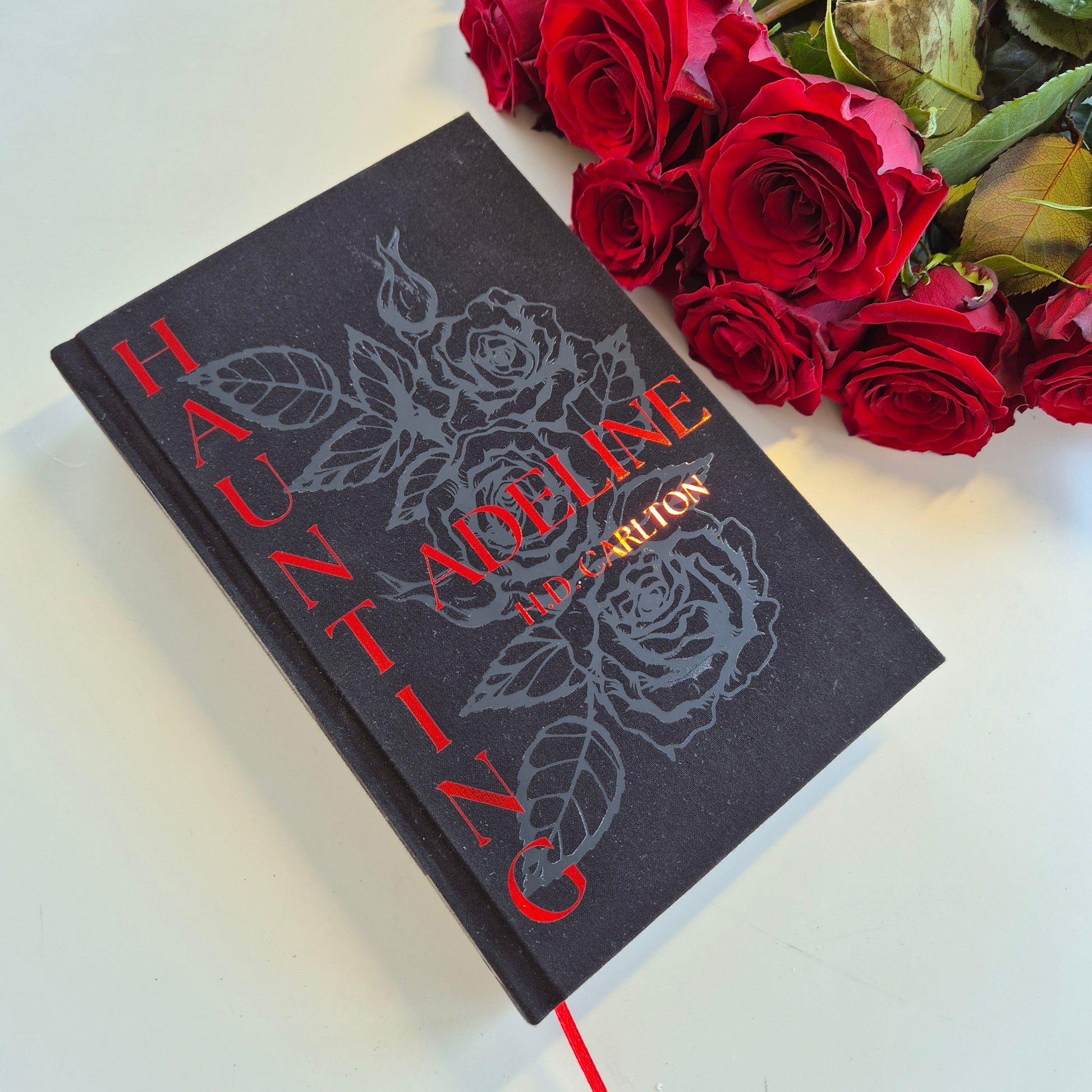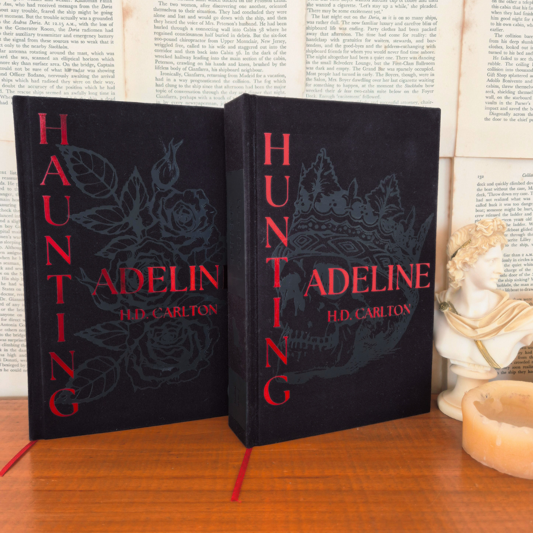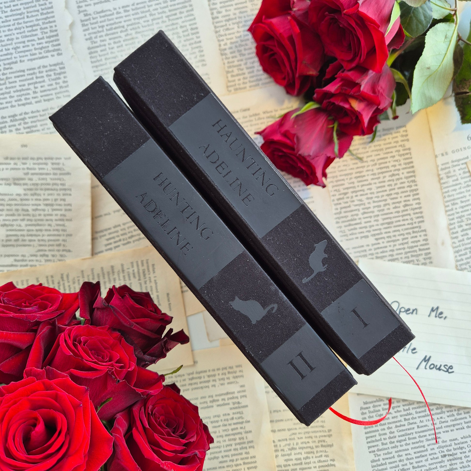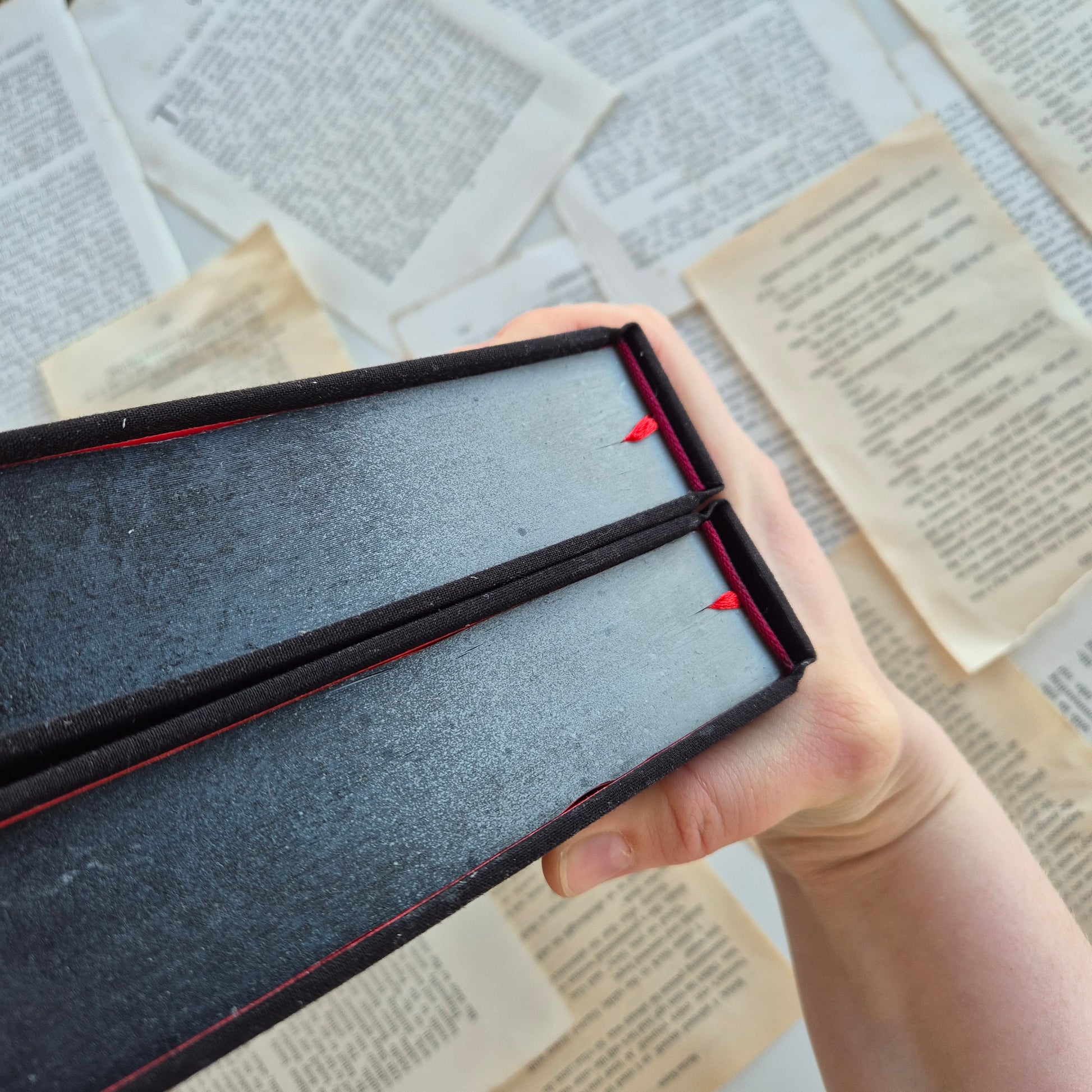Ils comprennent également des bords peints au pistolet avec un dégradé noir et gris. Chaque livre est livré avec un ruban de soie rouge et des pages de garde et des bandeaux rouges.