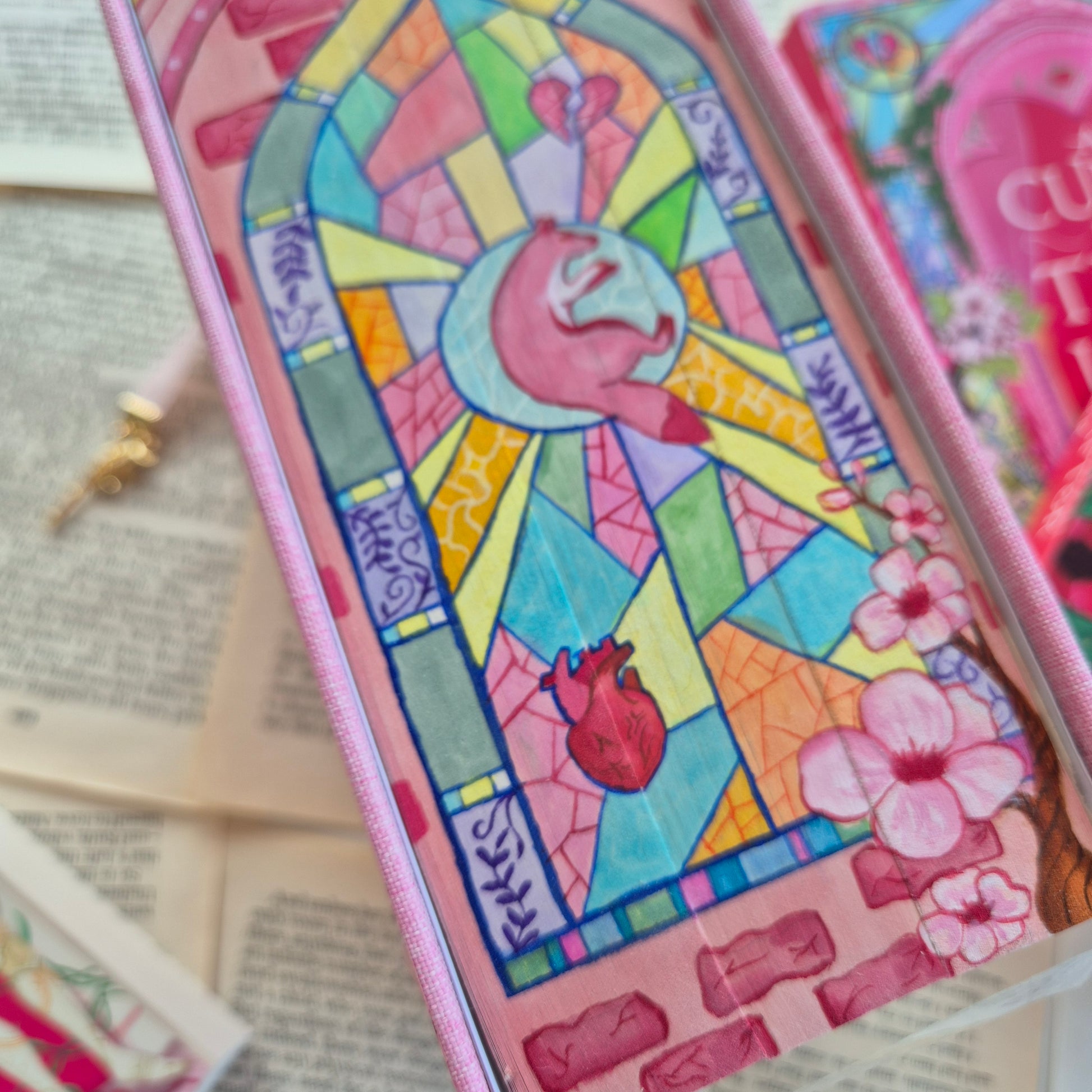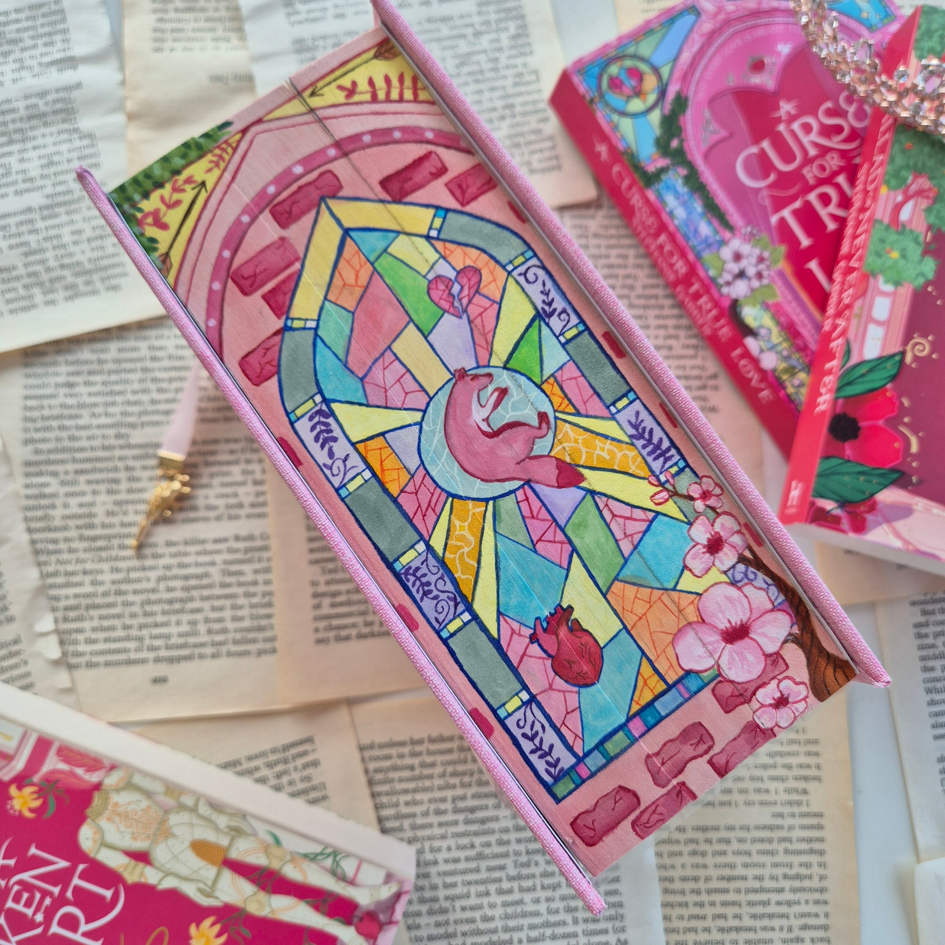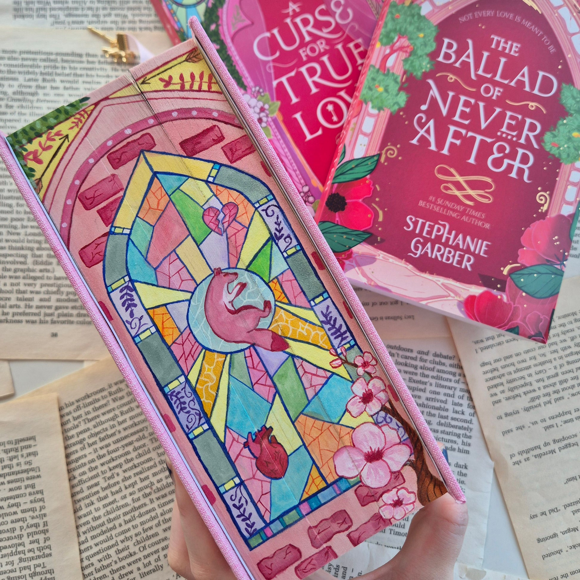 The watercolour edges are painted by hand by myself, in the style of a stained glass window with icons from the books covers and story. Painted over the course of days I took time to add as many hidden details as possible to complete the theme.