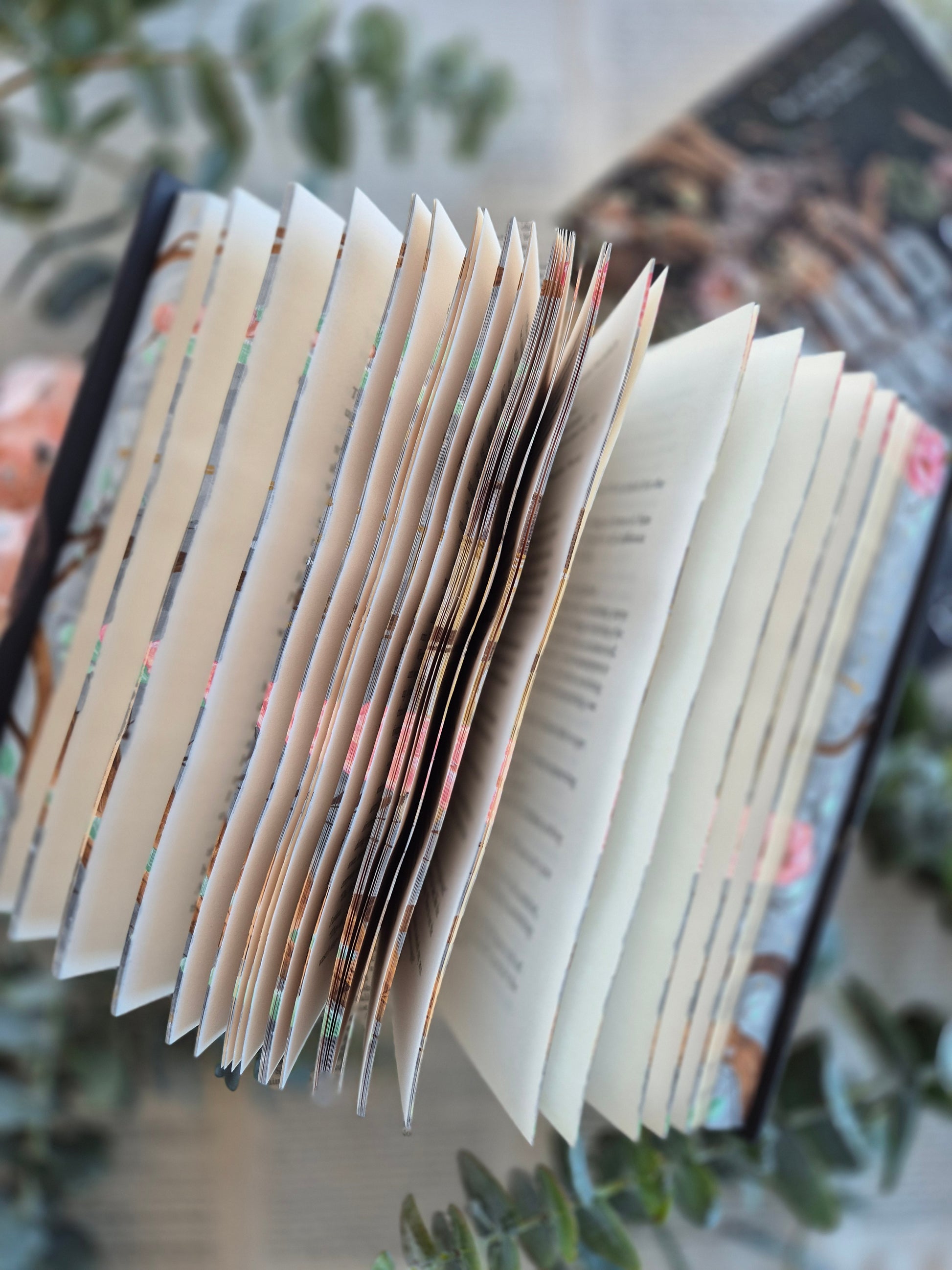 The edges are meant to continue the story of the dust jacket/cover with the peonies amongst the florals and branches and the golden sword.