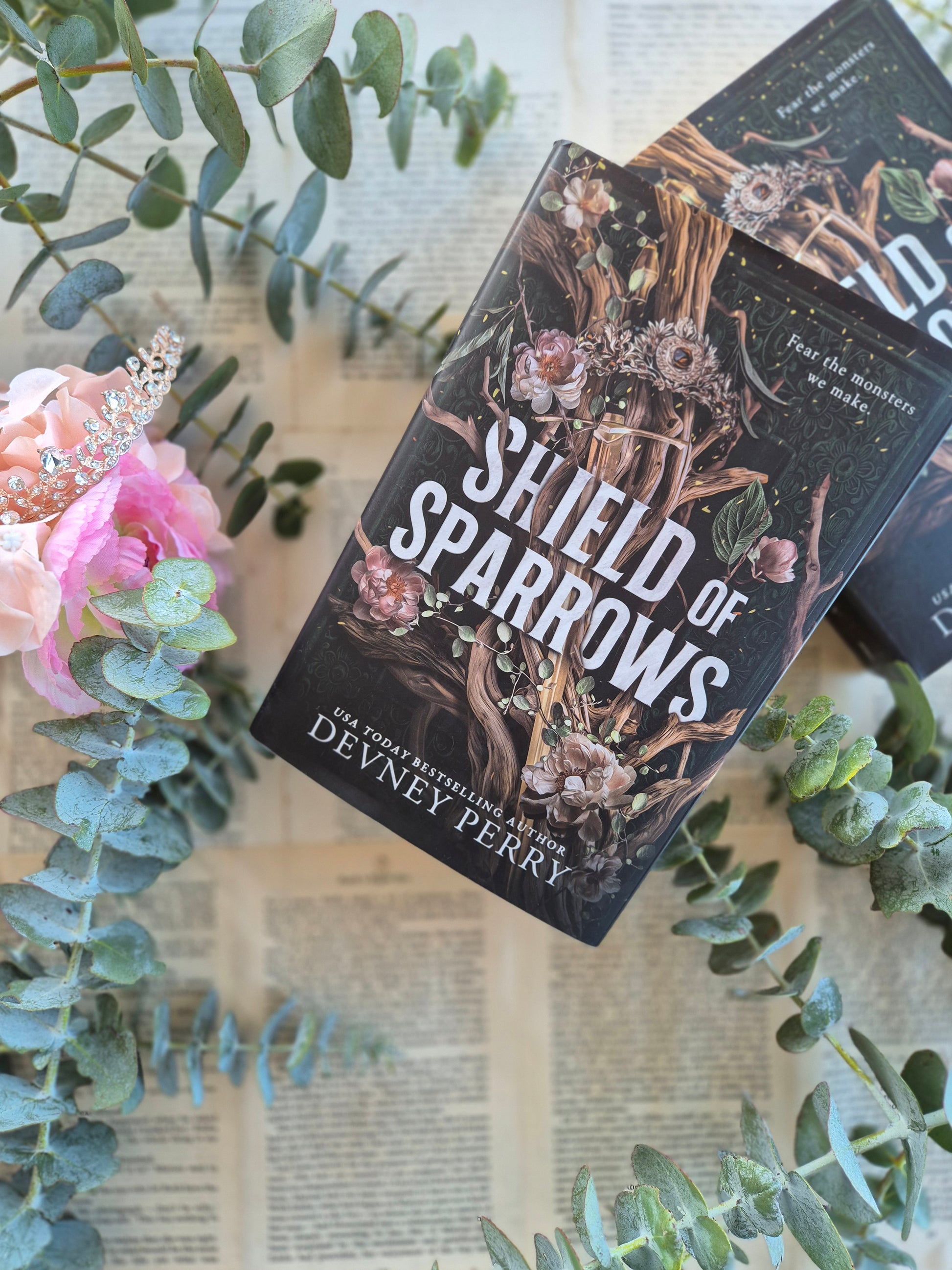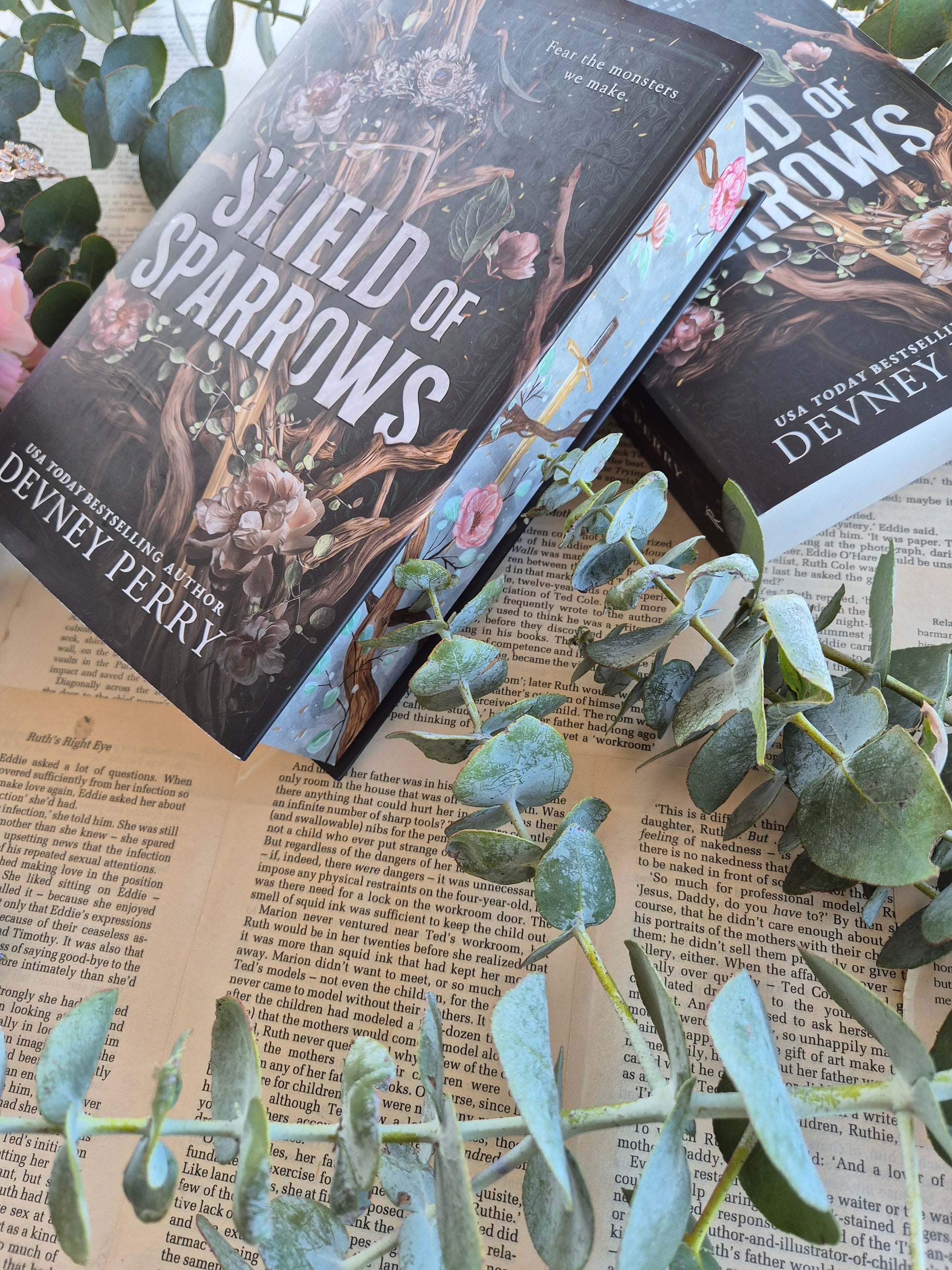 This is a Hardcover copy of Shield of Sparrows by Devney Perry with hand painted watercolour edges