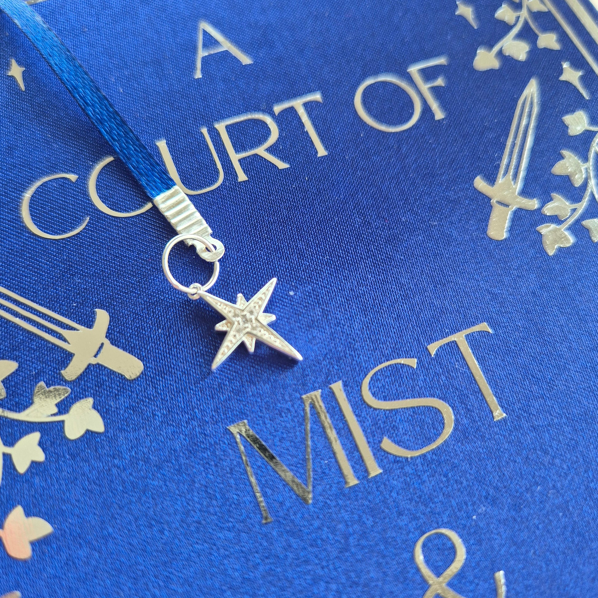 The book cover is a hand drawn design by myself in silver foil on a silk midnight book-cloth, the night blu endbands are accompanied by a silk book ribbon with a silver and cubic zirconia star charm.