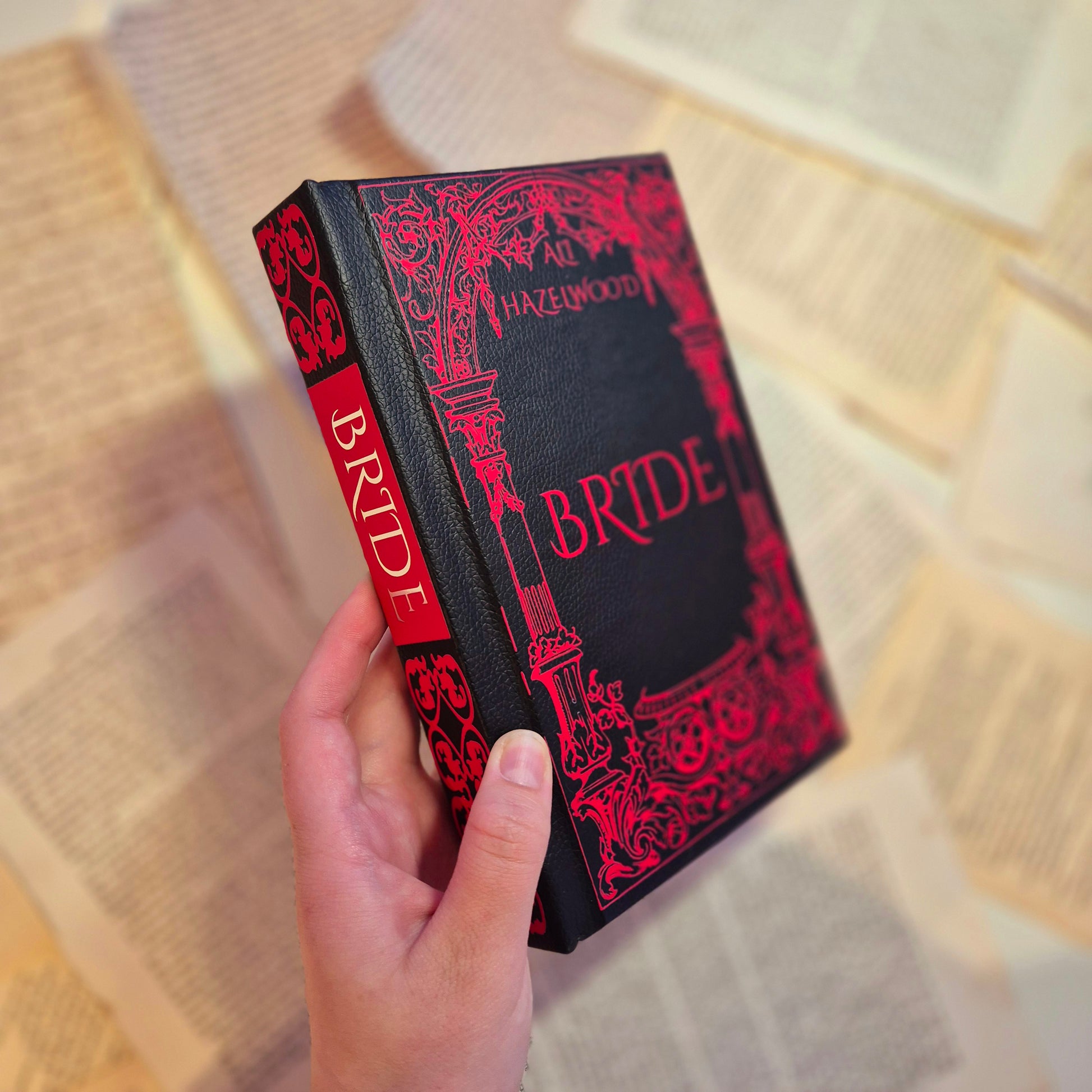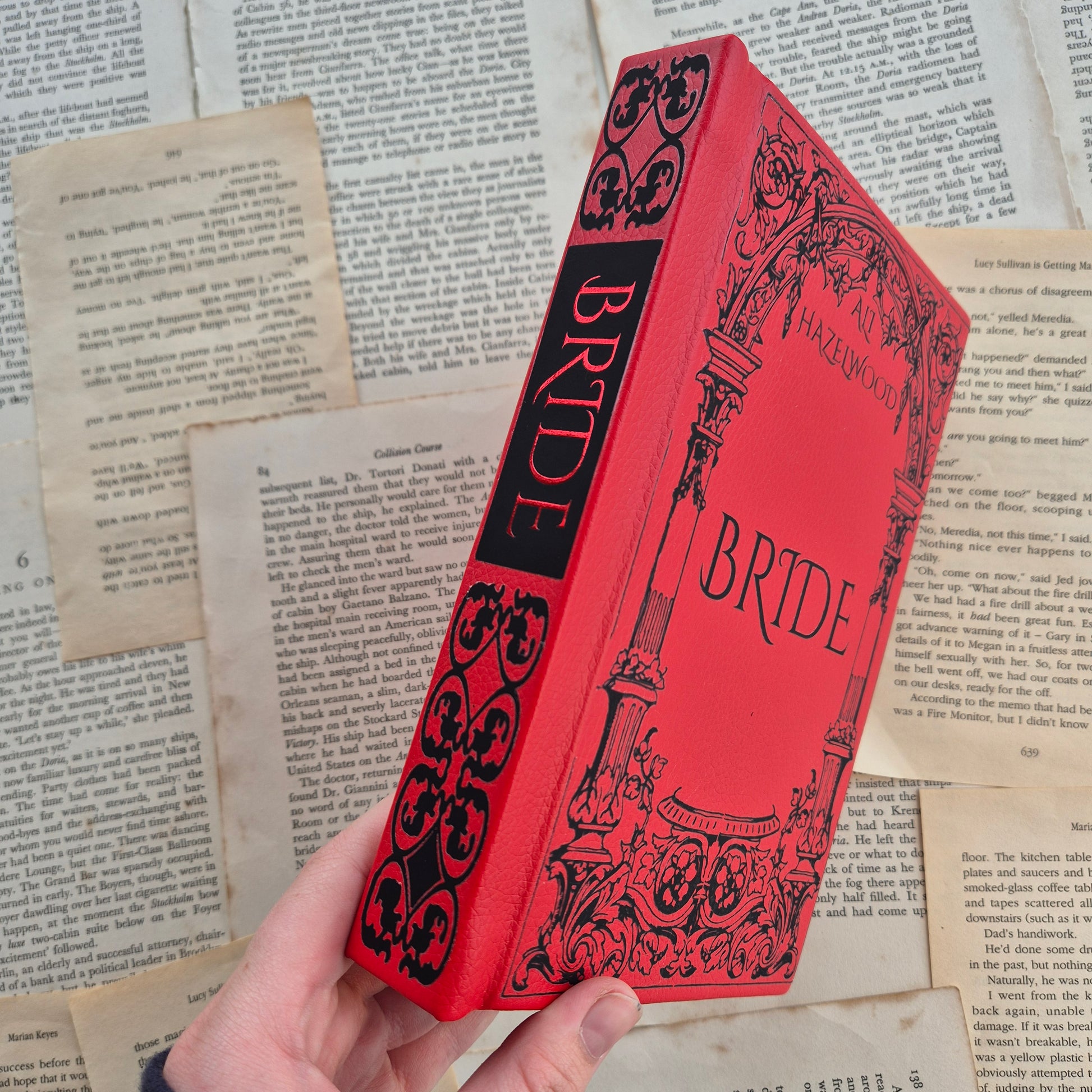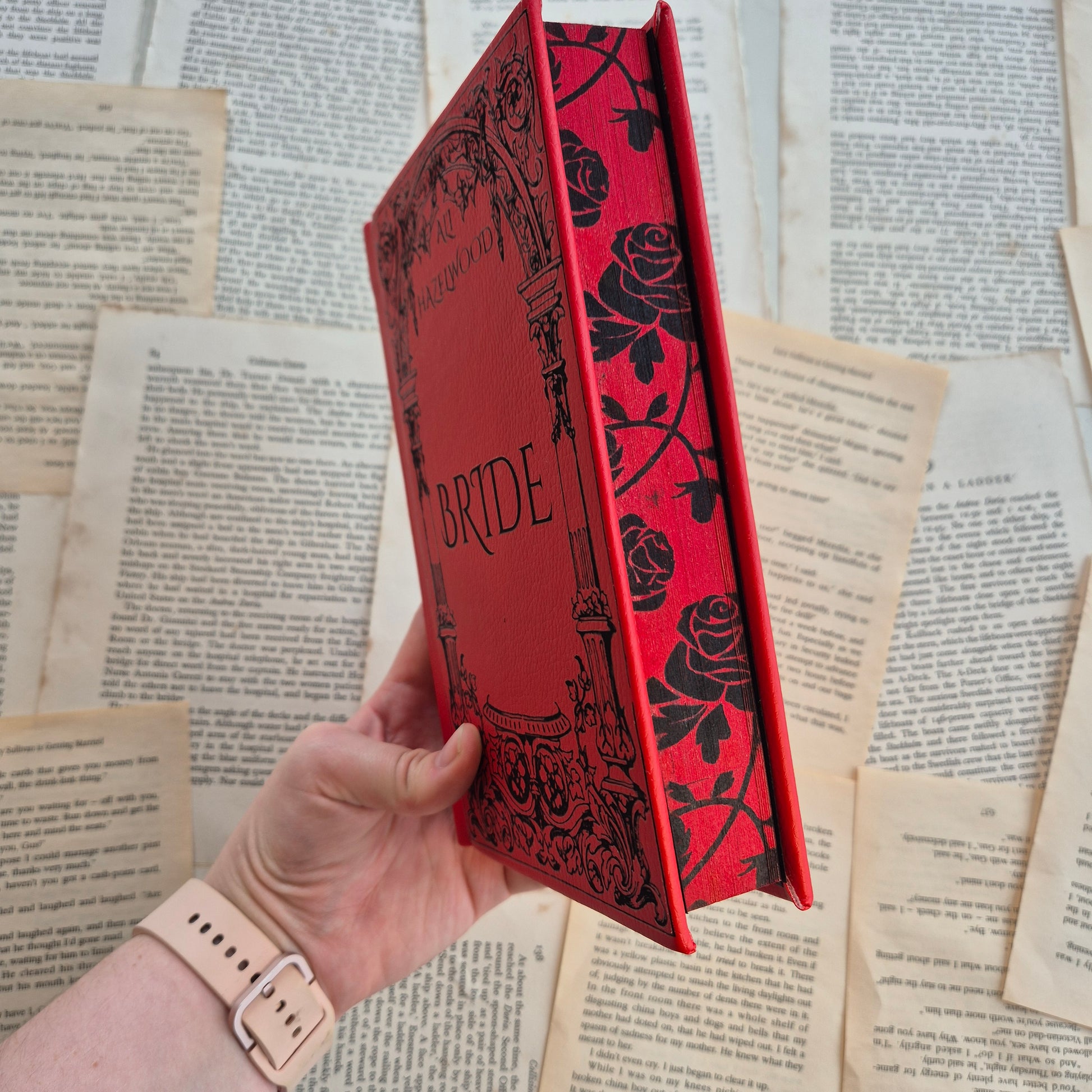 These are one of one rebinds of the novel 'Bride' by Ali Hazelwood that were hand rebound and designed by myself, one of the books includes sprayed edges of roses and thorns. Both books include burgundy endbands and soft faux-leather covers