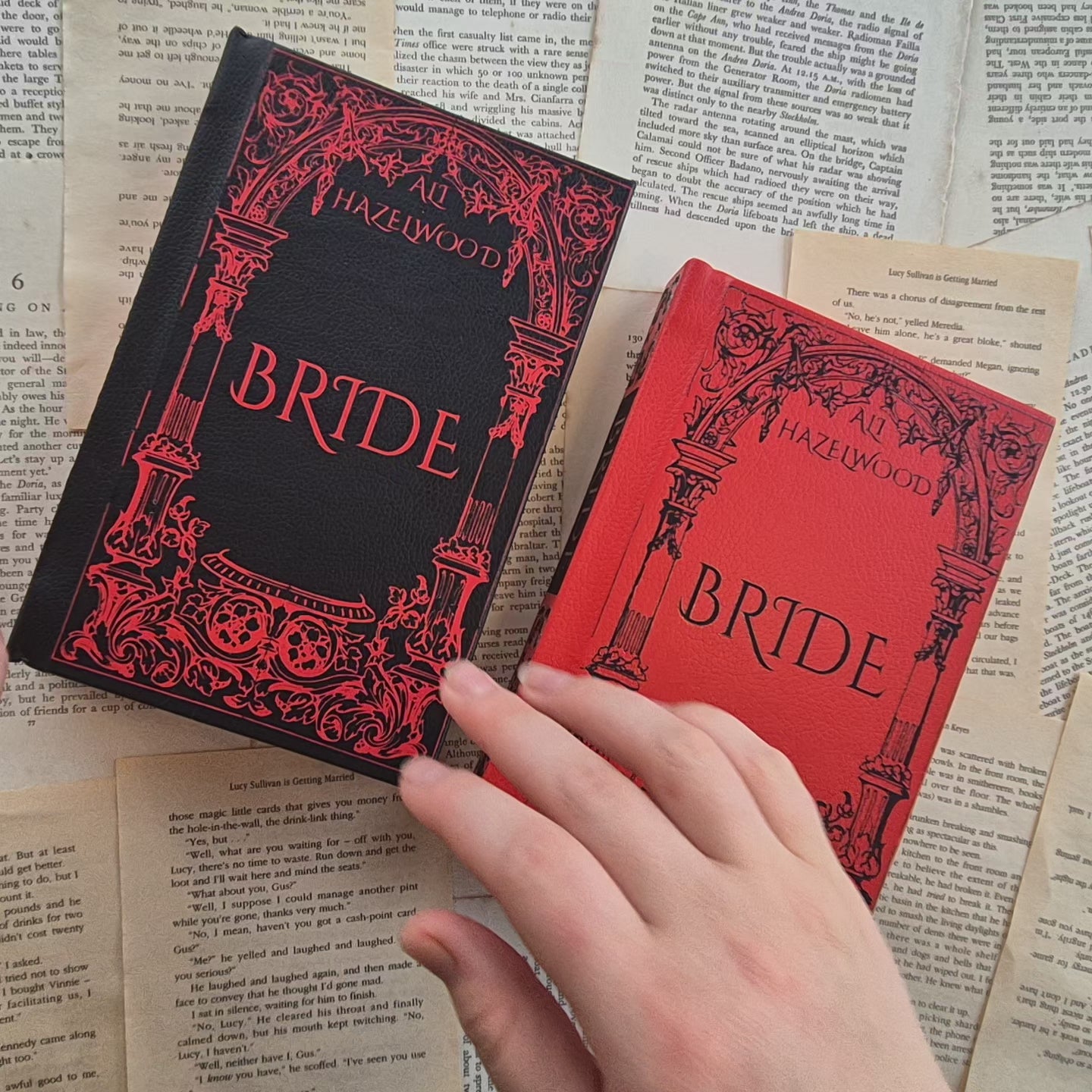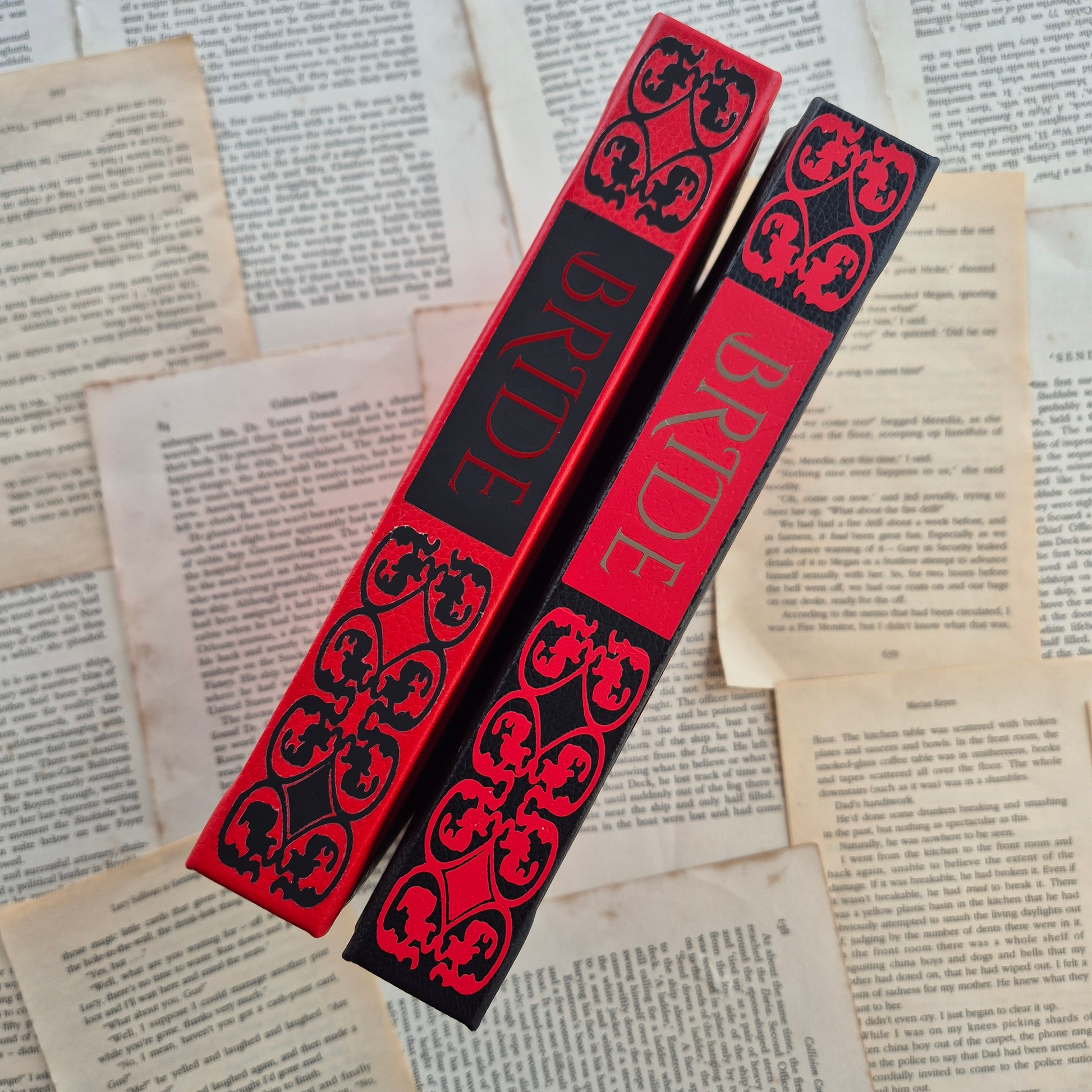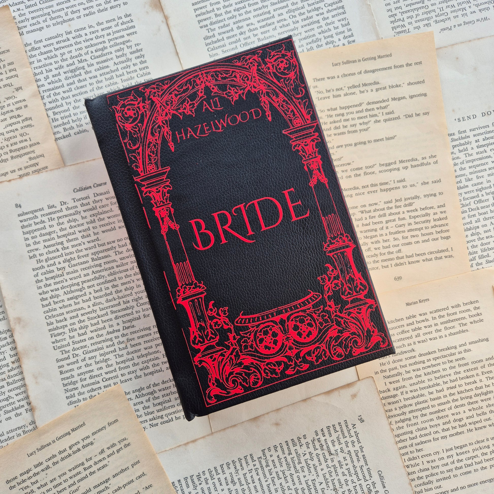 These are one of one rebinds of the novel 'Bride' by Ali Hazelwood that were hand rebound and designed by myself, one of the books includes sprayed edges of roses and thorns. Both books include burgundy endbands and soft faux-leather covers