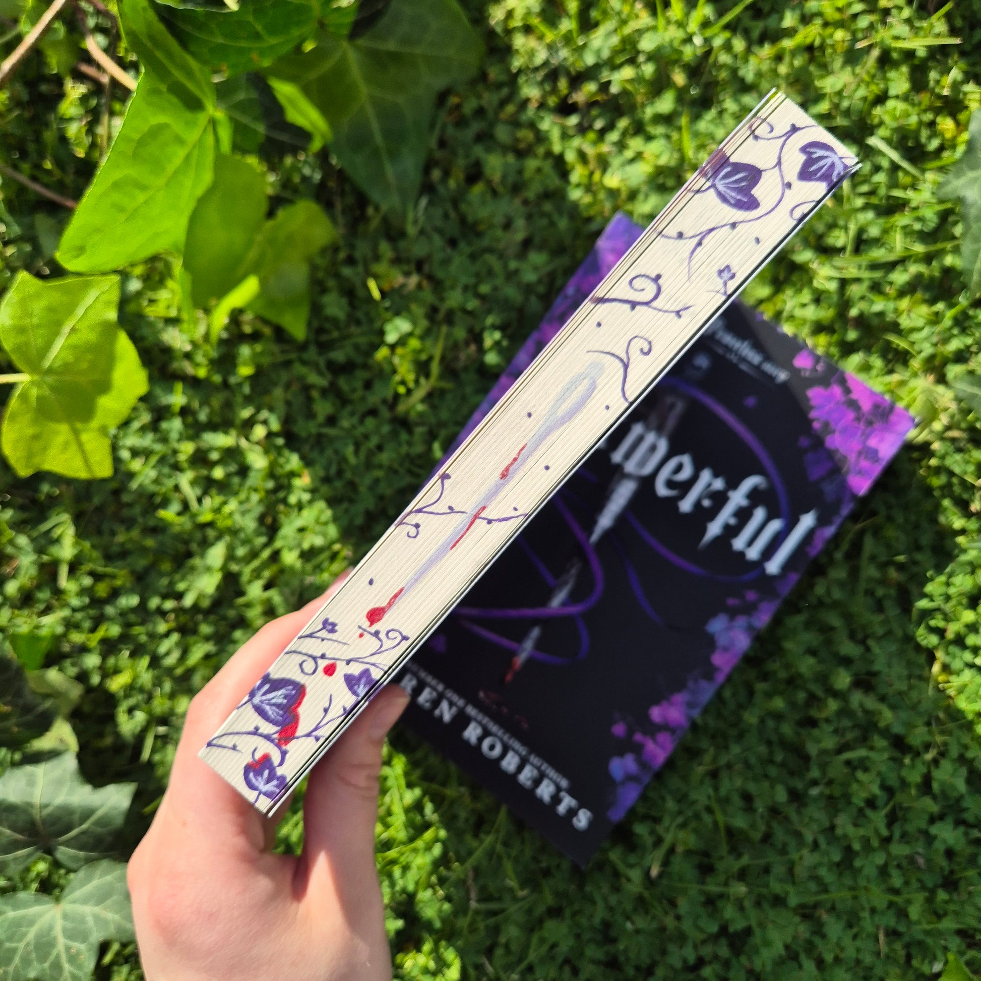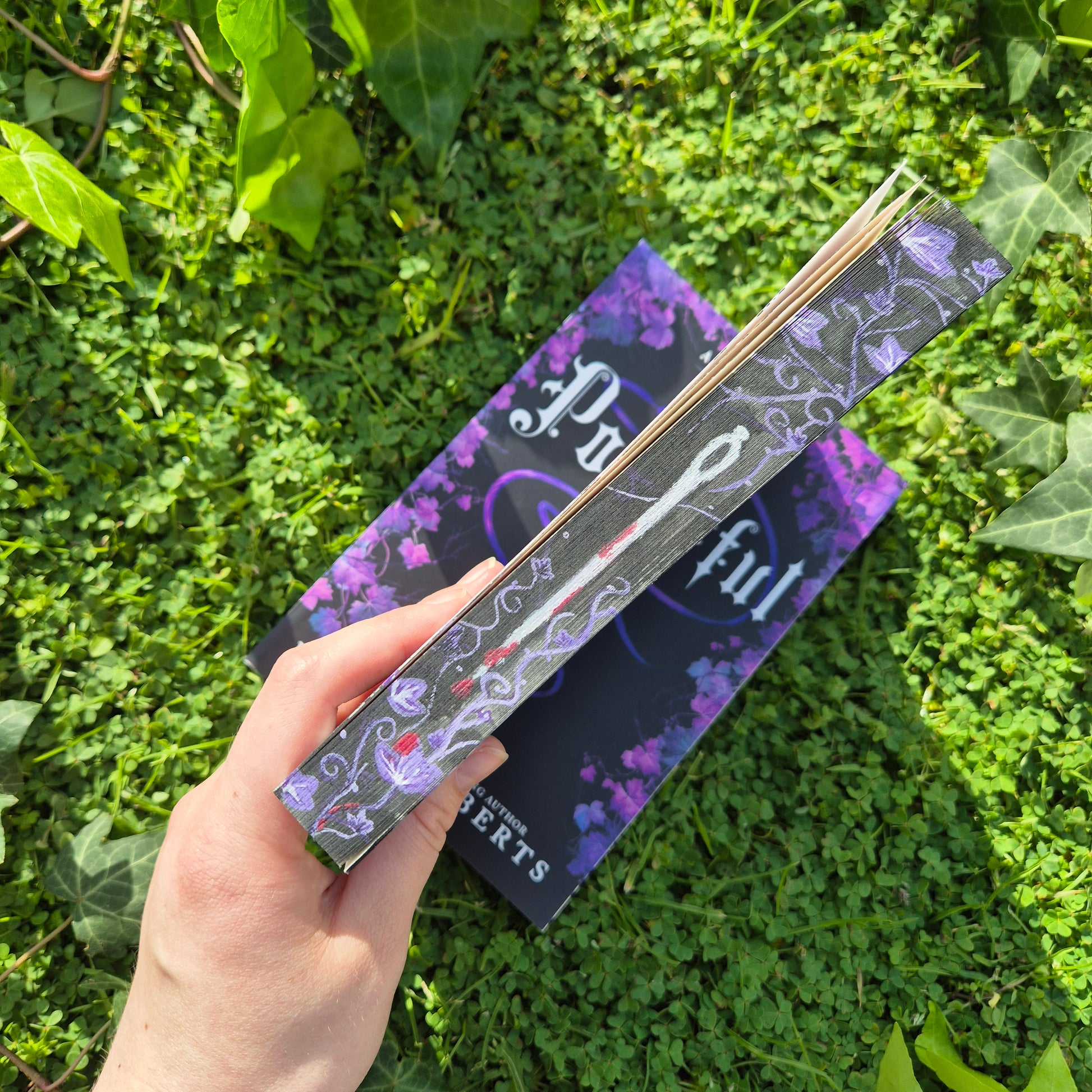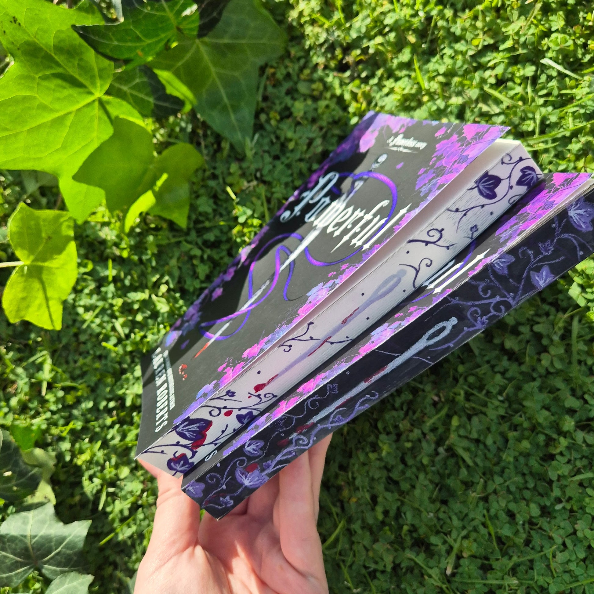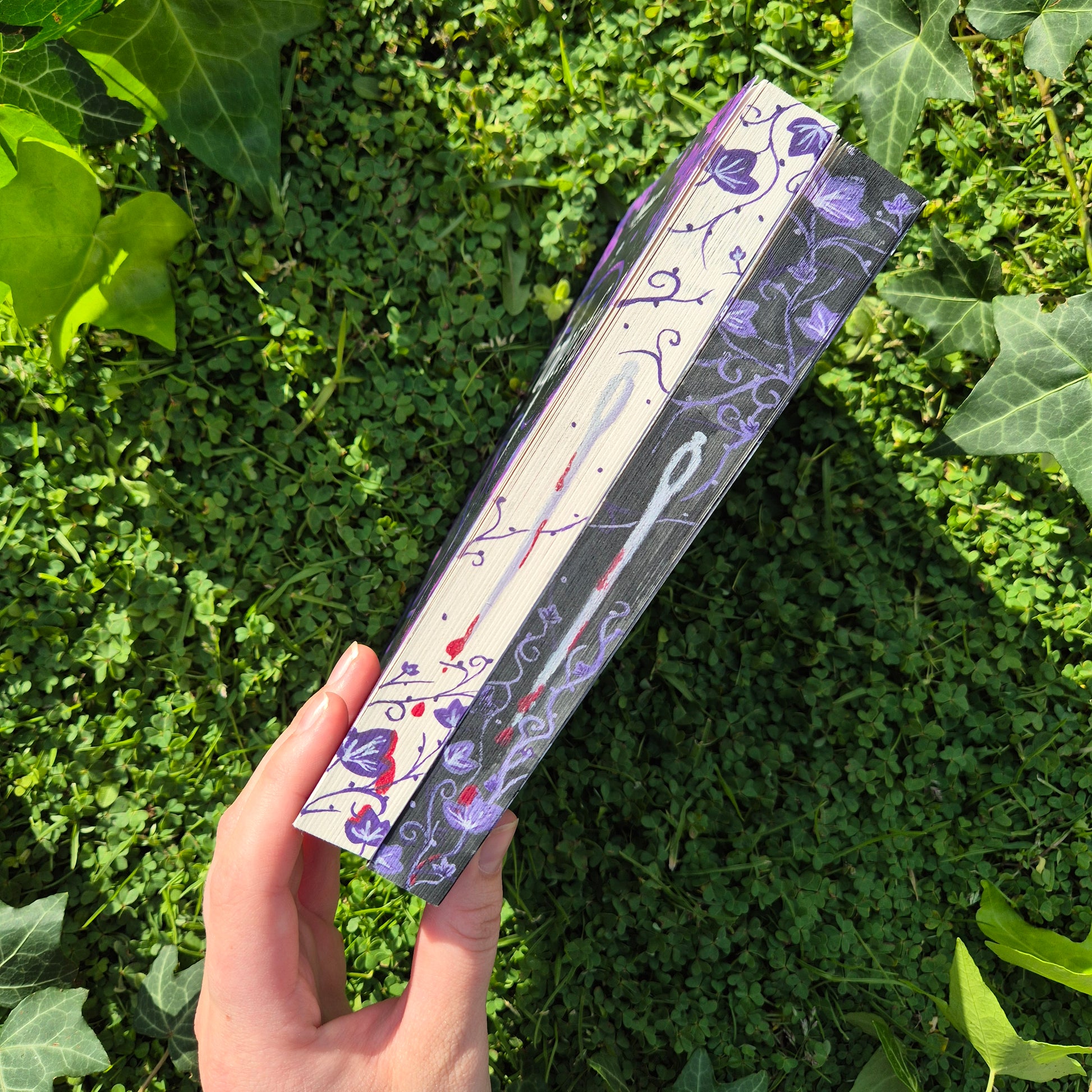 The edges depict a needle pricked by blood surrounded by purple ivy on a white or black background, these were all tirelessly hand painted by myself and the designs are direct inspiration from the story and the original cover.