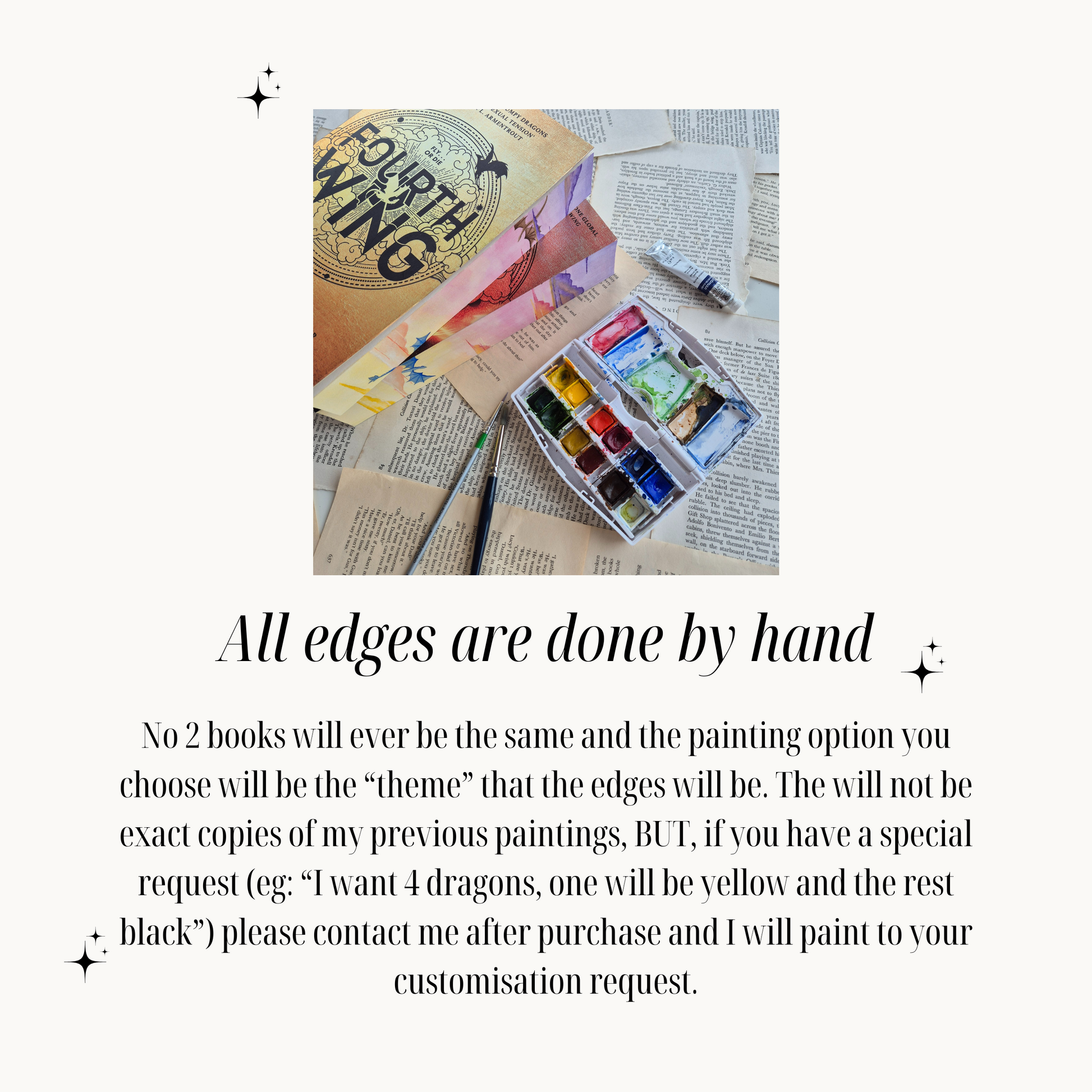 Please note: Only the front edges of the book will be painted, if you want all 3 edges painted please contact me before sale to organise /inquire as the cost can vary depending on what you want painted on the remaining edges.