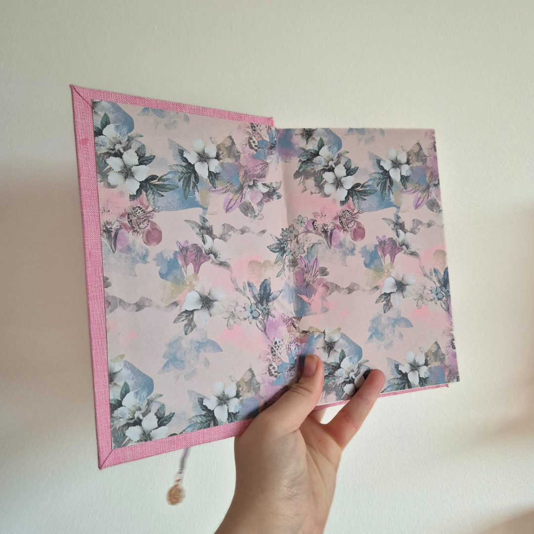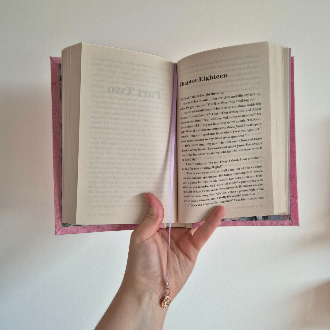 This is a hand made rebind of the Colleen Hoover novel 'It Ends With Us' with rose gold and pink vinyl detailing 🌷💕🌻