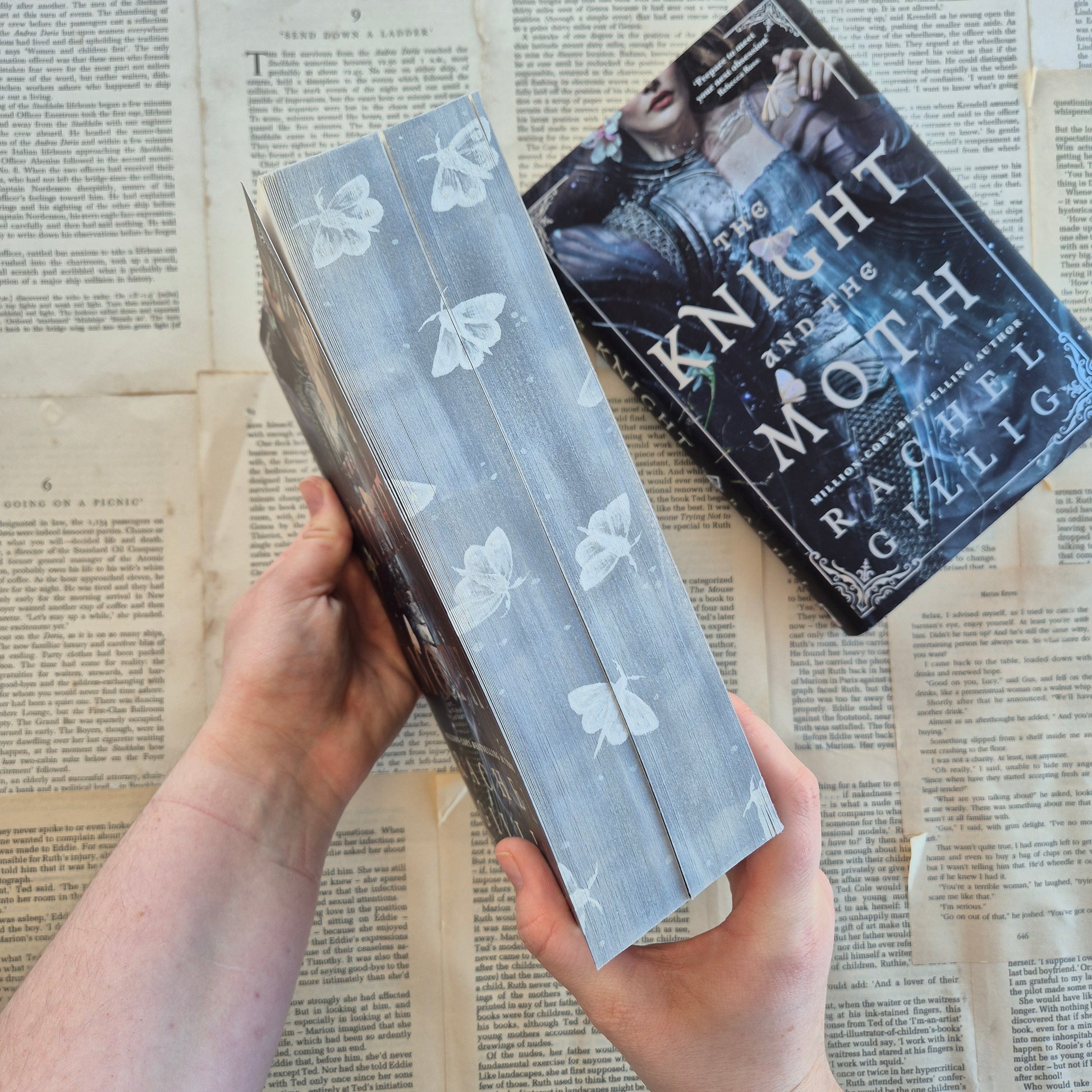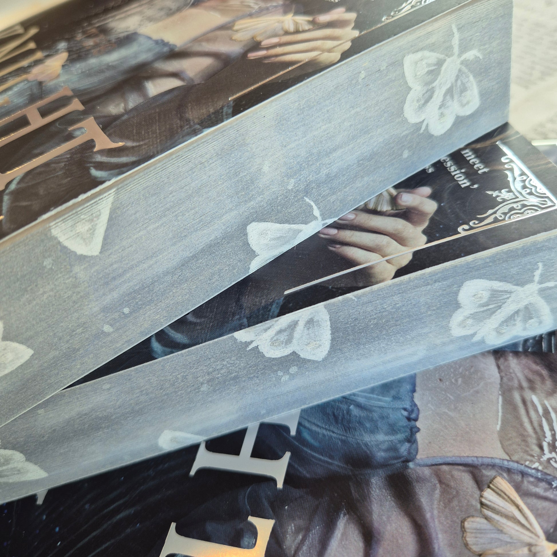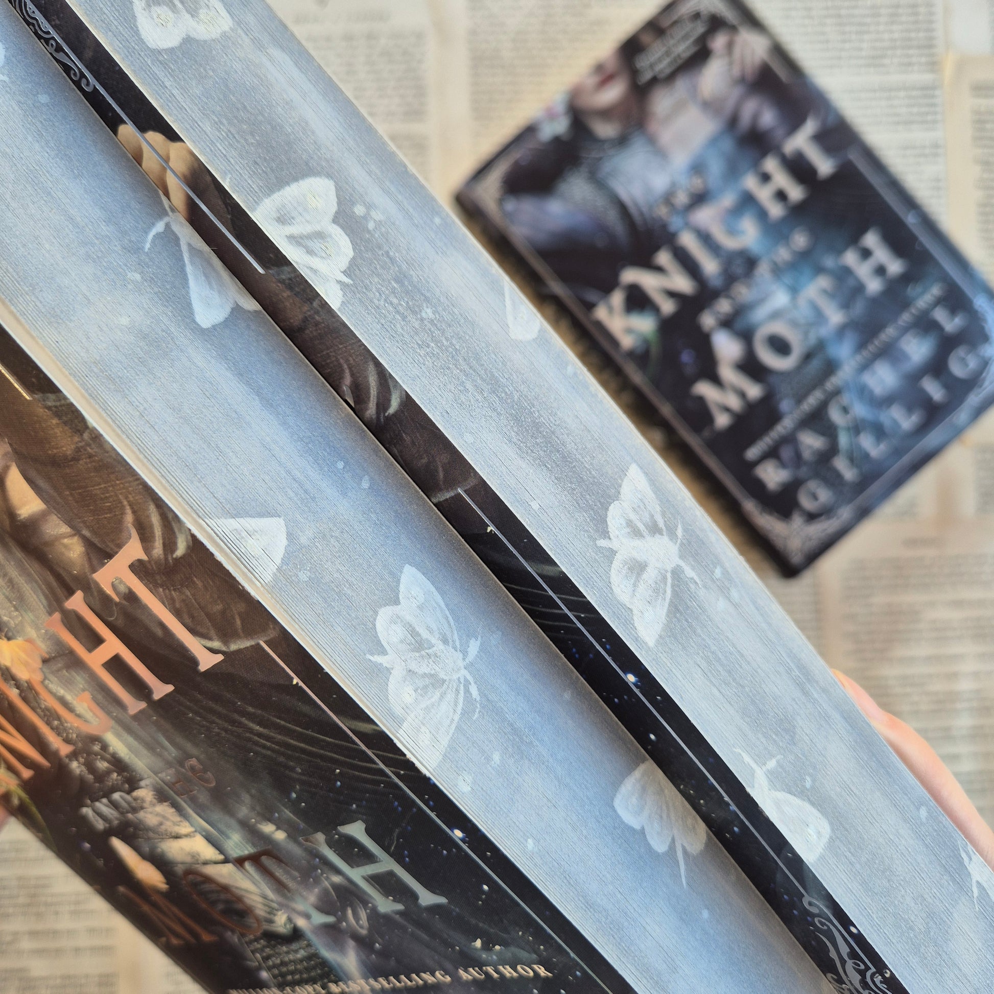 This is a watercolour hand-painted paperback of Rachel Gillig's Knight and the Moth. These are 2 paperbacks depicting cute little moths throughout the book's edges with metallic pearl detailing that can be seen when the sun touches the edges.