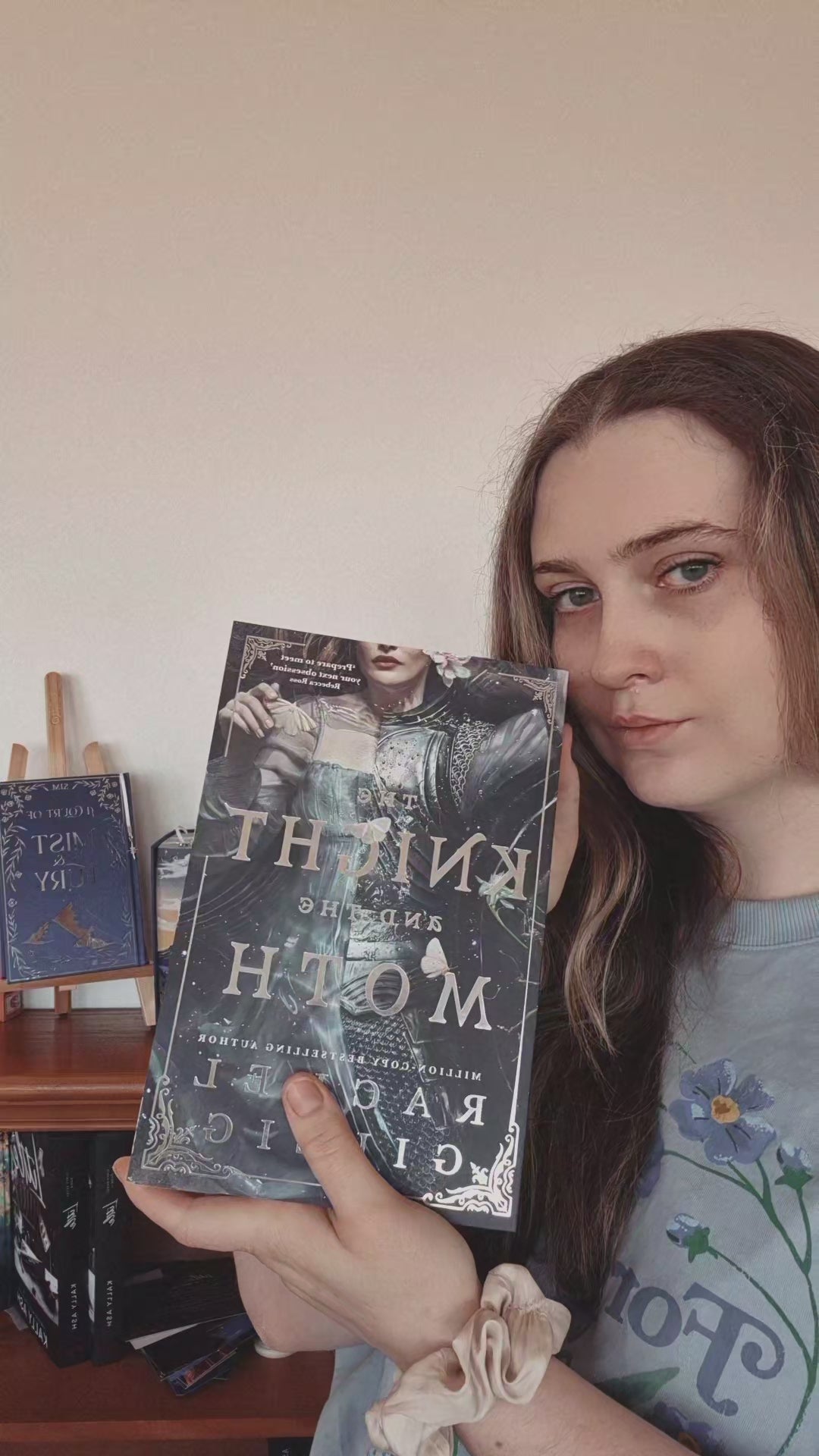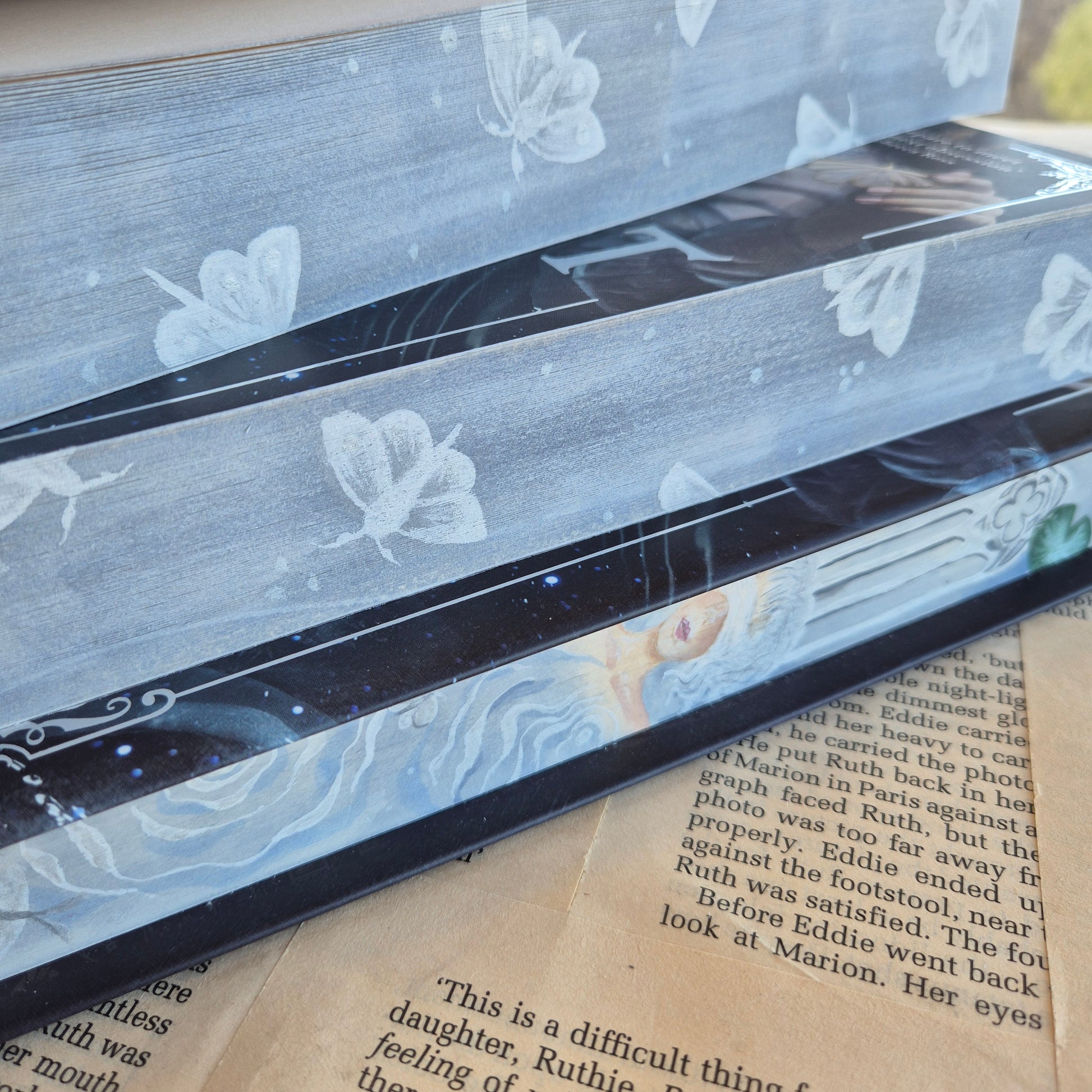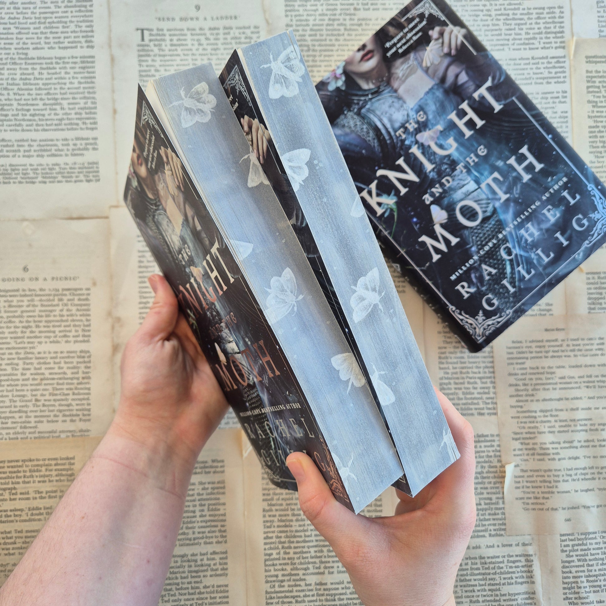 This is a watercolour hand-painted paperback of Rachel Gillig's Knight and the Moth. These are 2 paperbacks depicting cute little moths throughout the book's edges with metallic pearl detailing that can be seen when the sun touches the edges.
