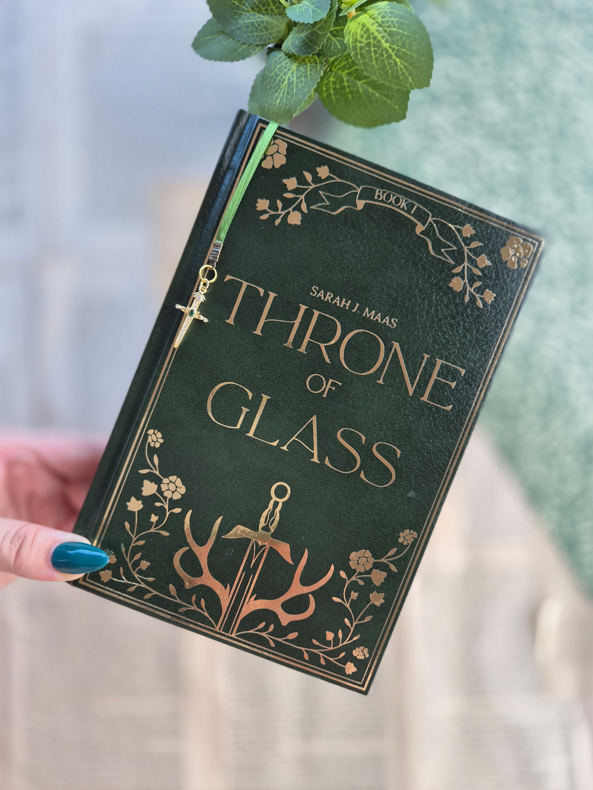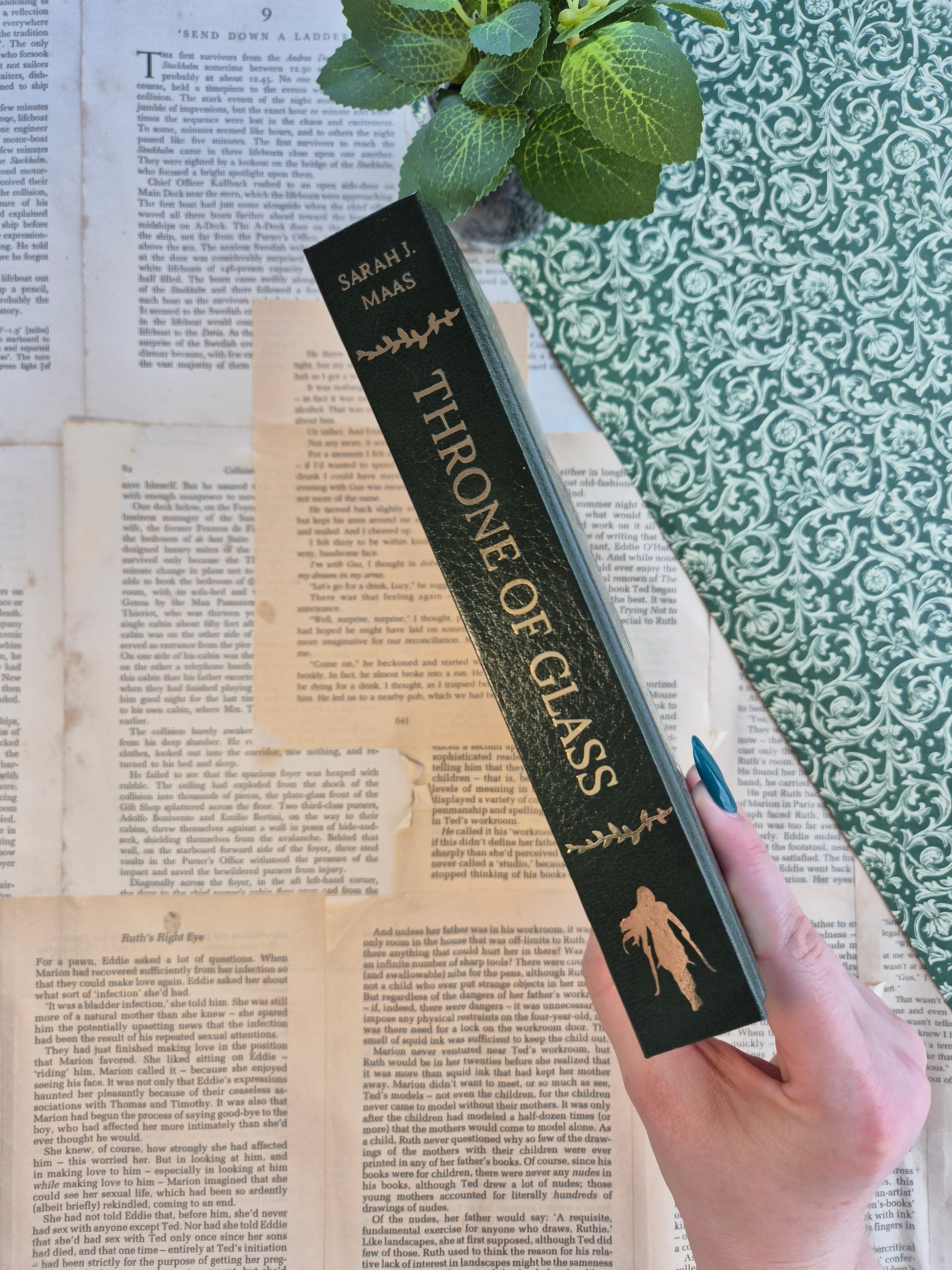 This is a luxe 1 of 1 rebind of Sarah J. Maas' 'Throne of Glass' done in a faux dark green leather with a custom gold foil design.