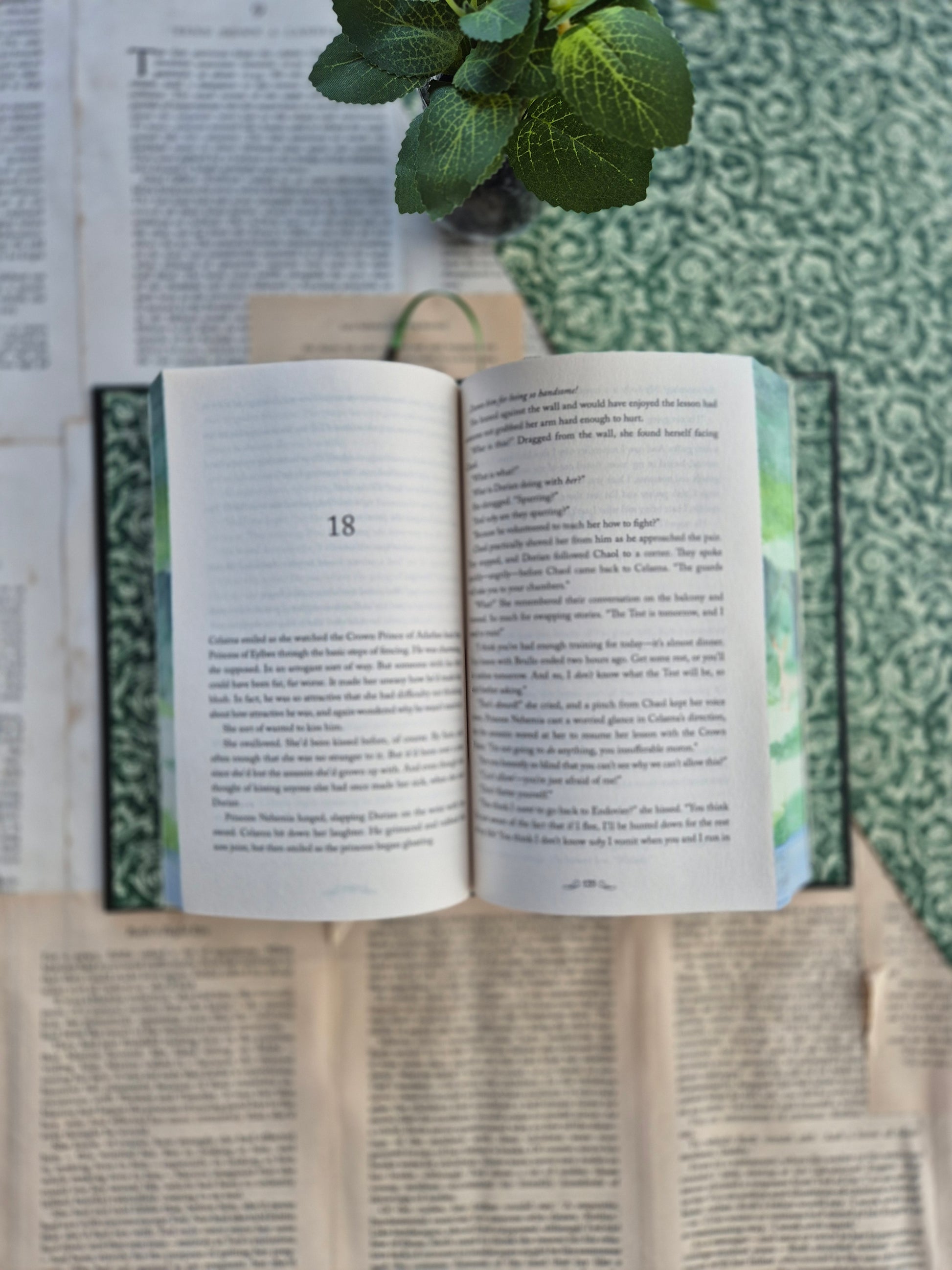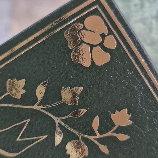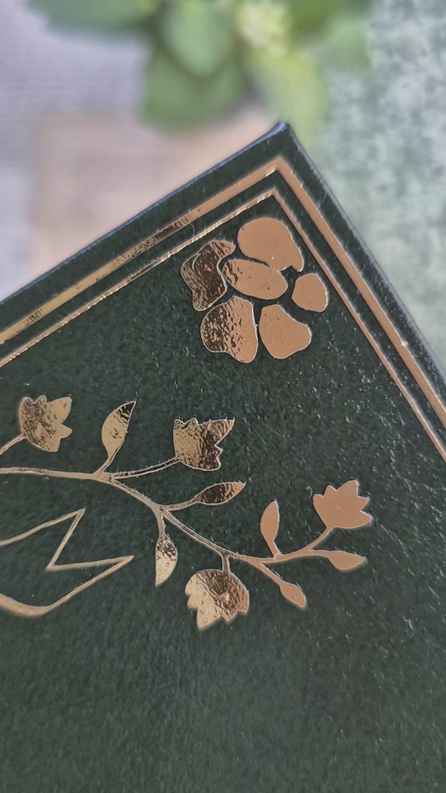 The endpapers are done in an Italian decor paper in a rich green to complement the watercolour painted edges of the book which are done by hand, depicting a stag in the forrest. The book is finished off with a gold and emerald charm of a sword to compliment the story of ToG.